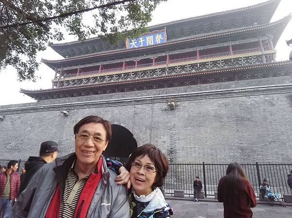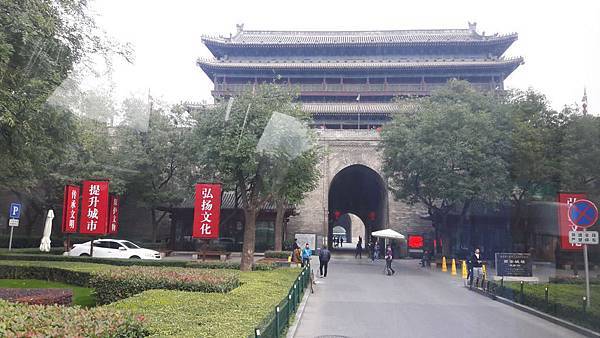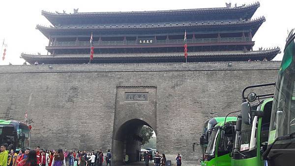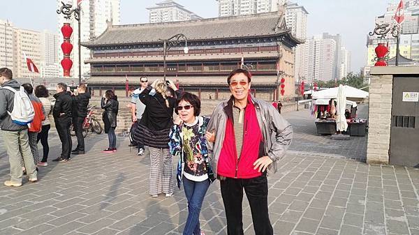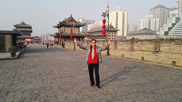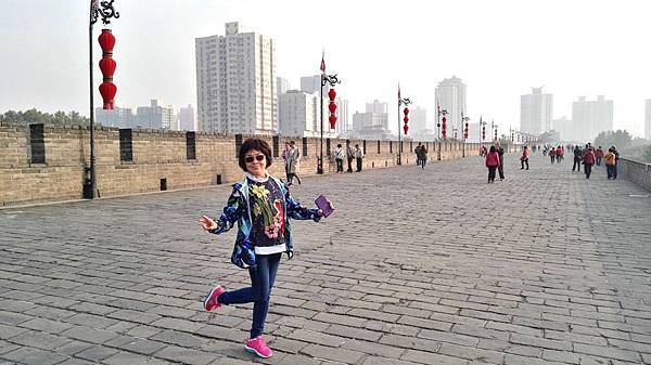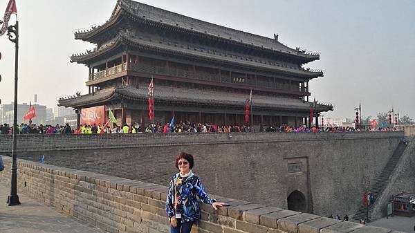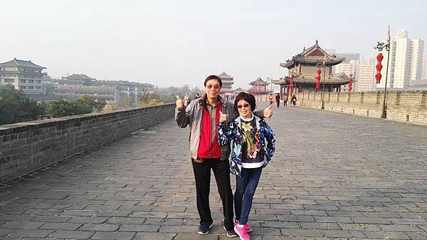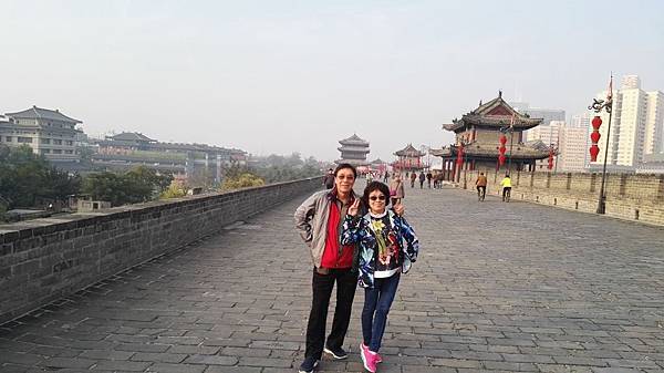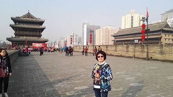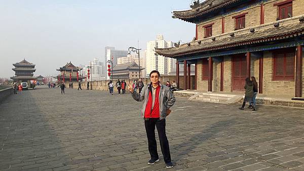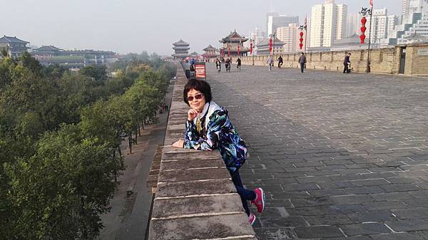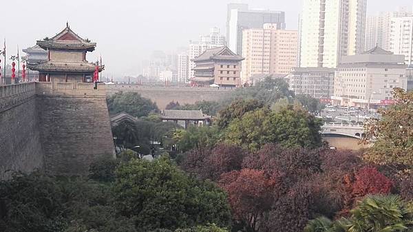 踏上石階步上古城牆瀏覽一番,城裡城外兩樣情、兩樣景;城裡古意盎然,建築物低矮,城外則是高樓林立。從城牆上居高臨下俯瞰西安市區,感覺空氣中到處瀰漫著古老又莊嚴的味道,加上黑沉沉的天氣,灰黑色的城牆建築,西安真是名副其實的老古都。