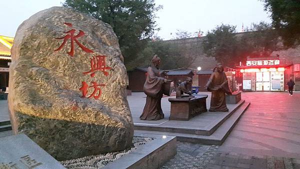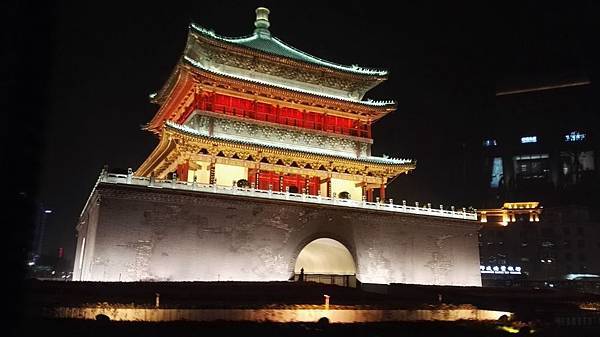 不知不覺逛到街尾,就是著名的鐘鼓樓區,也是來西安的遊客必到的景點。鐘鼓樓建於明洪武年間,晨鐘暮鼓,這是當年百姓習慣的作息的依據。從鐘鼓樓折返回集合地點時,天色已暗,我們再驅車前往永興坊吃地方著名小吃~肉夾饃。