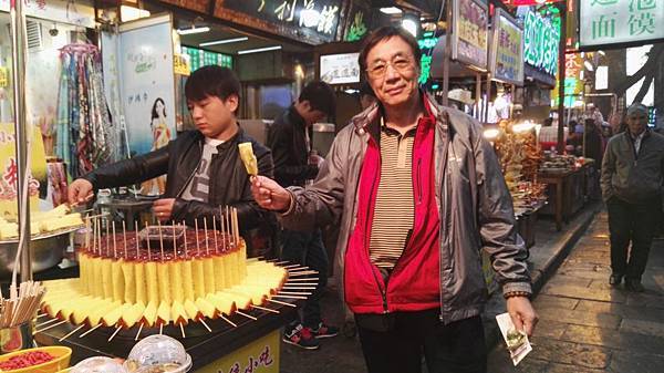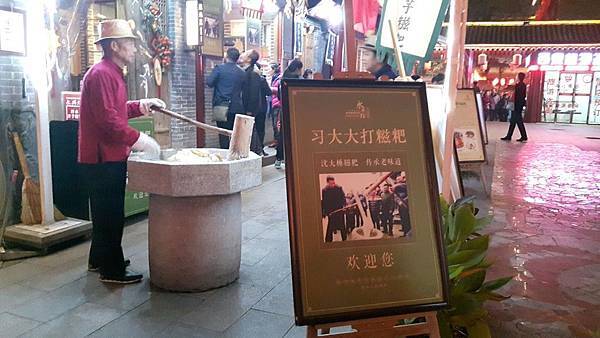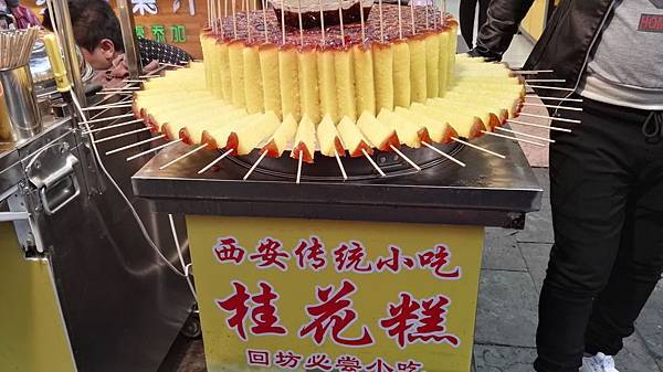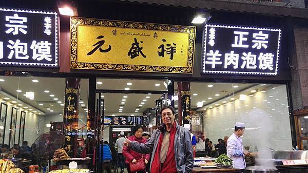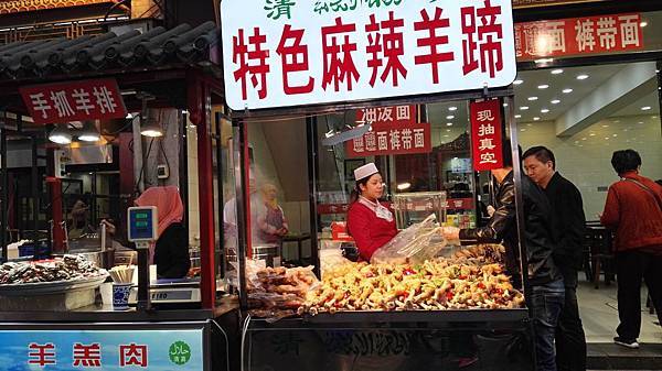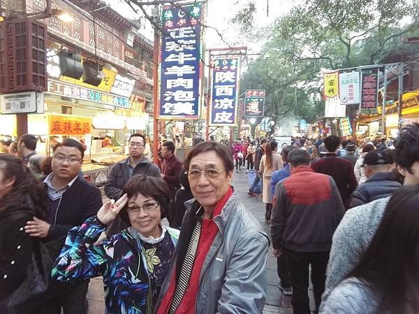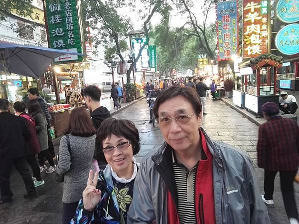 下午4:35分集合後前往回民一條街。西安回民街是回民區的一條美食街道,長大約500公尺左右,青石鋪路,綠樹成蔭,行入和遊客熙來攘往,好不熱鬧。街道兩旁清一色仿明清建築,門前掛著閃亮燈泡的各種攤鋪,販賣糕餅及小吃餐飲店、美食攤、紀念品店等,幾乎全由回民經營,具有非常濃郁的清真色彩。