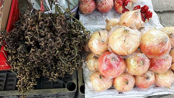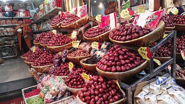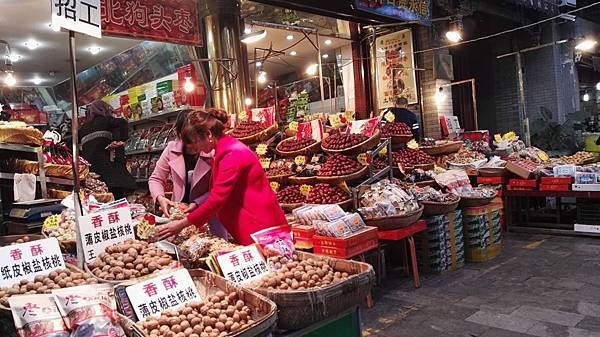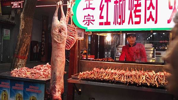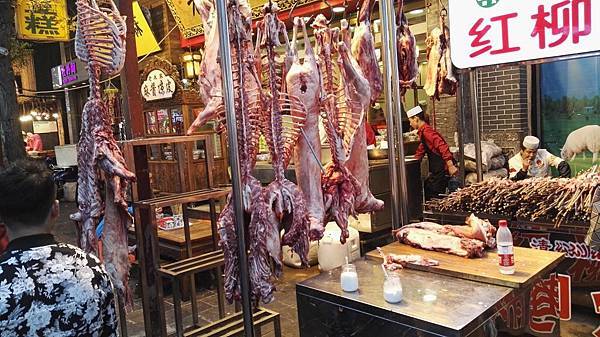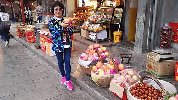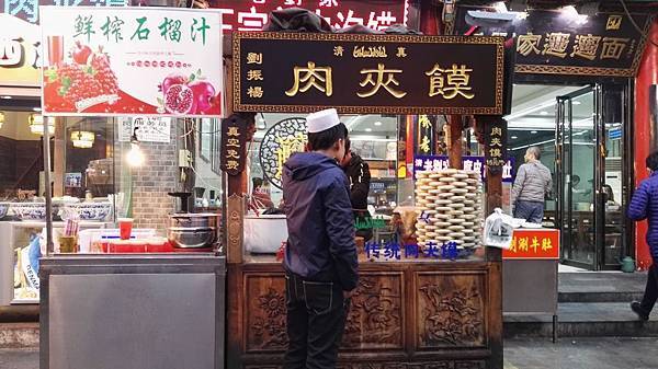 逛回民一條街,才知道羊肉是回民的最愛,烤羊肉串的煙霧和香氣瀰漫整條街道,連店門口也擺满桌椅,坐著不少客人。烤肉串、涮羊肚的碳火燒得通紅,熙熙攘攘的人群都是邊逛著邊吃著,羊肉攤上吊掛著整頭甚至數頭剝了皮的羔羊,攤位上成排的羊肉串、羊膝、羊蹄、羊頭、肉夾饃、桂花糕、灌湯包子……琳琅滿目,看得我眼花撩亂。整條街被濃濃的市井氣息籠罩著,香味撲鼻的美食,看得肚子都餓了,但孫導曾一再交待我們別在這裡吃,他會帶我們到永興坊去吃西安最好吃的肉夾饃呢。忍著餓,買了幾個碩大的石榴,石榴是我每來內地必吃的水果,這裡的石榴脆、甜又多汁,每天要吃兩顆才過癮。