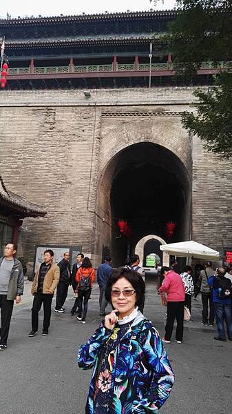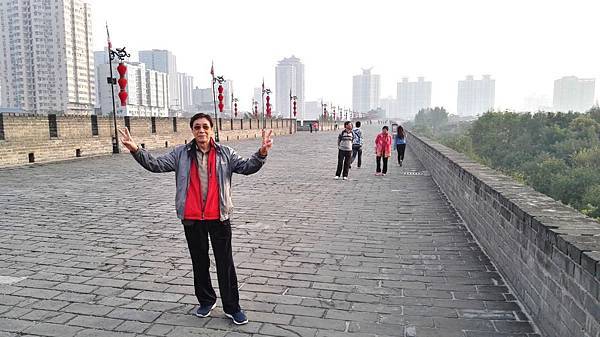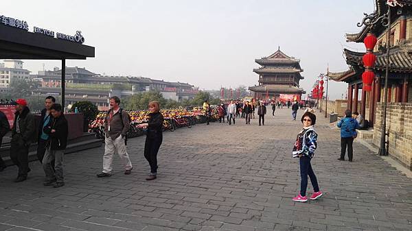 城牆上很熱鬧,遊客不少,如時間許可,最好租部自行車繞城牆一周,我們時間有限,只好看看景、拍拍照。城牆建築設計周全;包括有護城河、吊橋、閘樓、箭樓、正樓、角樓、敵樓、女兒牆、垛口等一系列軍事設施,另外每隔120公尺修敵台一座,突出在城牆之外,這是專為射殺爬城的敵人設置的,城牆上的一磚一瓦都做得紮紮實實,給入有固若金湯之感。我們站在城牆上瞭望兩端,彷彿站在歷史的過去與現在,思古之悠情不禁油然而生。