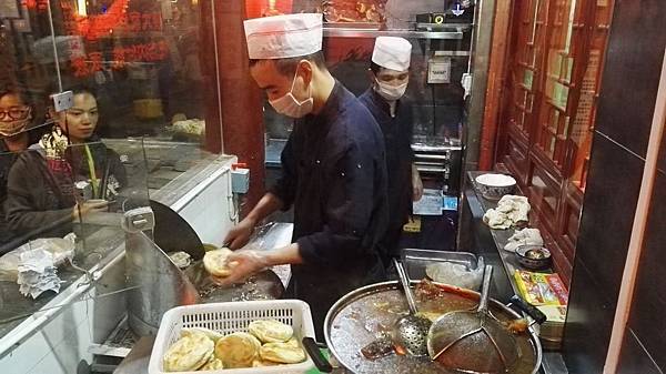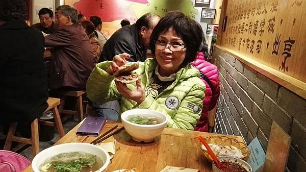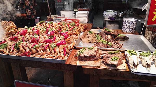 肉夾饃真的好吃,它是歷史悠久的一種陝北小吃,有點像台灣的卦包,不同的是饃是用死麵烤的,口感比較酥硬,夾著肥而不膩的臘肉或紅燒肉來吃,香噴噴。Biang Biang麵也叫褲帶麵,一條長又寬的麵,據說當初就是以摔打麵團時發出的聲音而得名,此麵食是陝西八怪之一喔。永興坊還有很多小吃,如涼皮、板栗餅,肉泡饃、醬驢肉等等,可是一個肉夾饃和羊肉湯下肚後已經很撐,連Biang Biang麵也無福消受了。