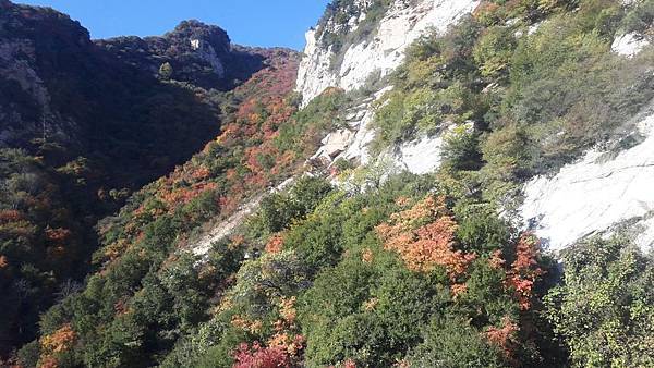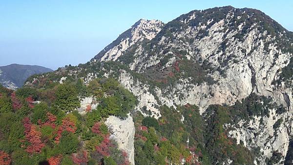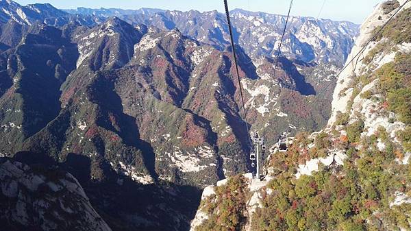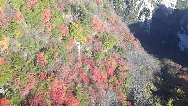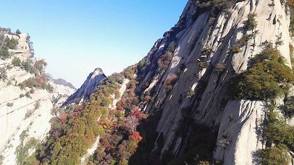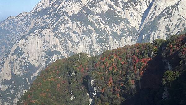 華山固然以奇險著稱,可是讓它更流光溢彩的,卻是紅葉。華山的紅葉一叢叢、一簇簇,與鬱鬱蔥蔥的杉木青松、灰白的花岡岩山體交相輝映,美景天成。索道全程都能欣賞到紅葉,真是一件意想不到的小確幸,紅葉也使得整個華山份外妖嬈。