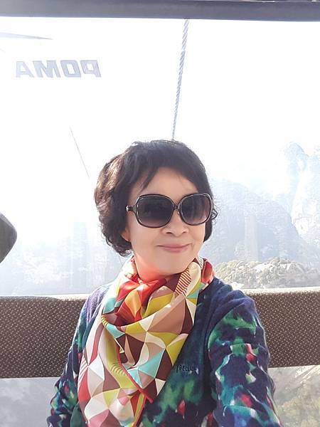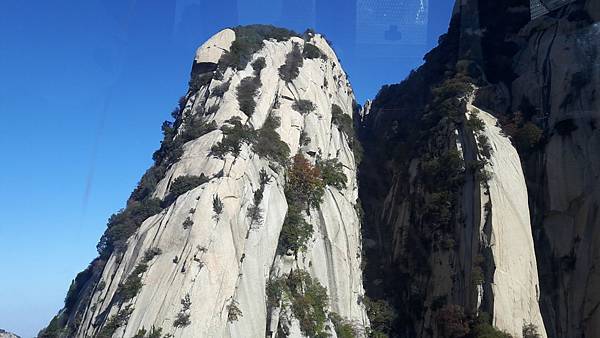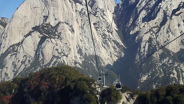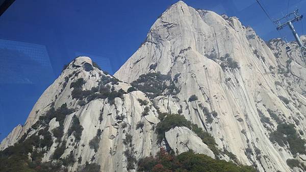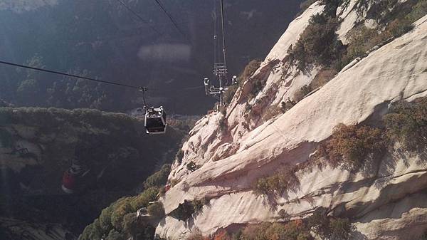 一次可載客8人的纜車緩緩前進攀升,漸漸地群山與白雲都在腳下,感覺獨立昂然,心中更是驚喜交集,因為華山的圖片看多了,但從沒想過有登上華山的一天。車窗外不斷出現的花岡岩懸崖峭壁似乎伸手即可觸及,白雲如棉絮般飄蕩在山腰,有懼高症的人此刻也許不敢俯瞰沿途險峻風光,但索道平穩舒適,起起伏伏之間,除了讚嘆華山之絕世美景,更難以想像此索道工程之艱辛。