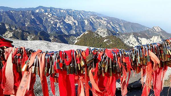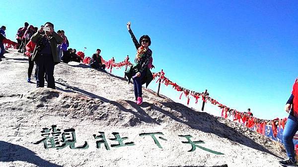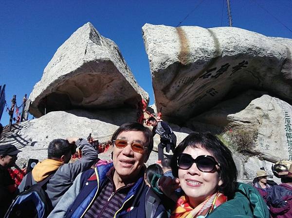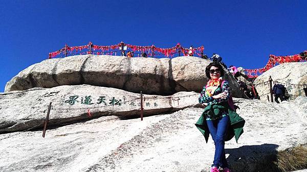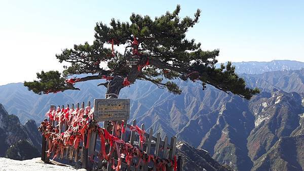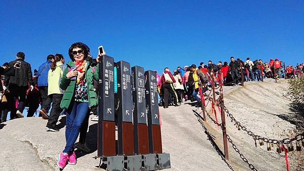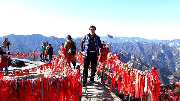 努力不懈的繼續攀爬下,我終於來到南峰頂。登臨絕頂,放眼四下,頓感青天在握,星斗可摘。舉目環視,天地之悠悠,群山起伏,蒼蒼莽莽,八百里秦川,全在腳底下。南峰峰頂上一樣是人滿為患,只要一不小心很容易就被擠得滾下階梯。峰頂上一塊地標即是三角點,旁邊還有一個小小的、不太起眼的許願池,拍了照片,小心翼翼步下陡峭的石坡再趕往下一個景點~「華山論劍」石碑。