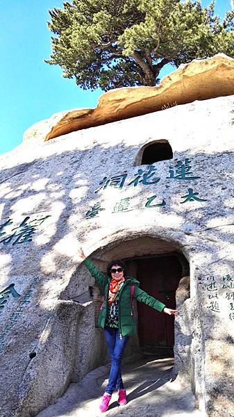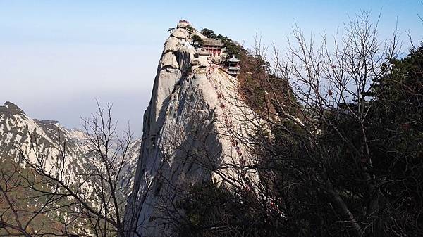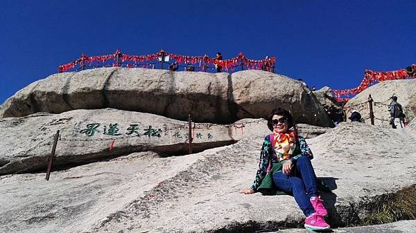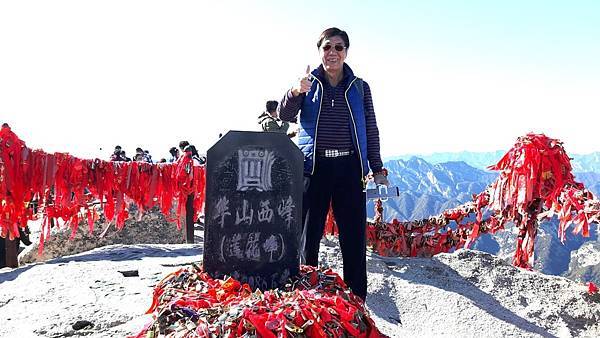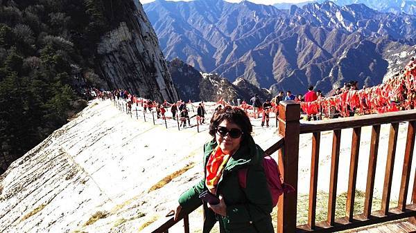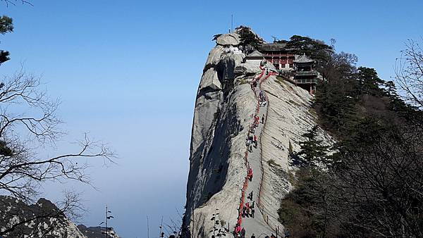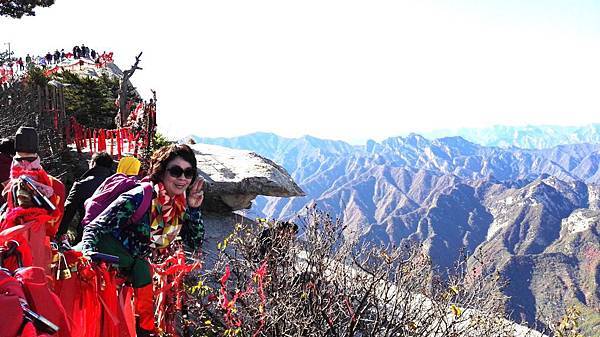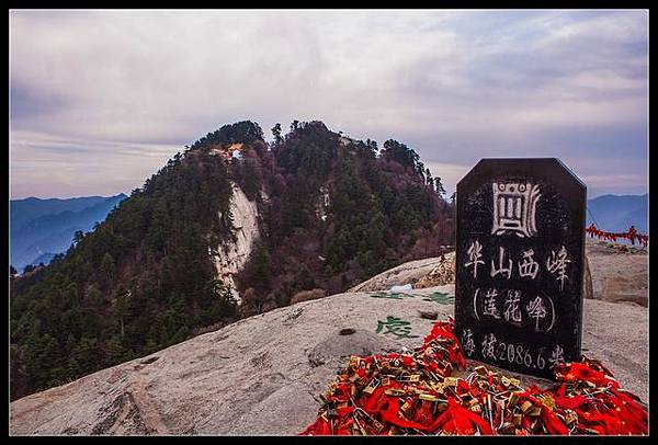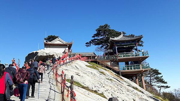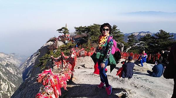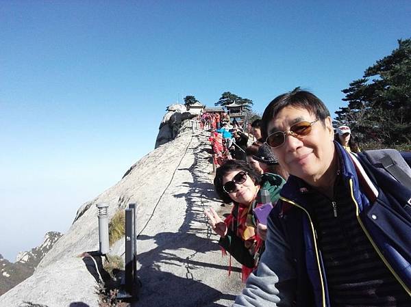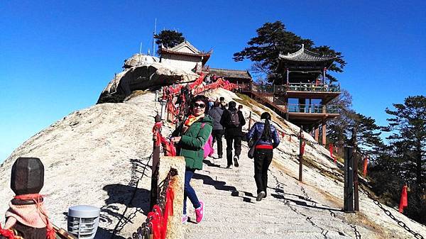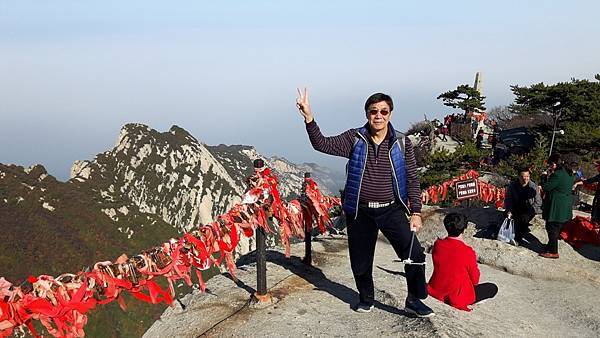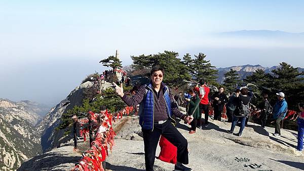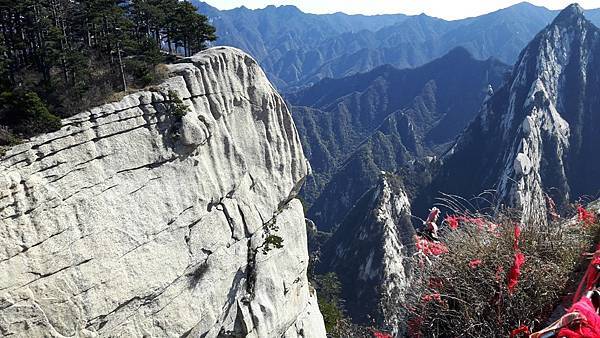 纜車抵達西峰站,接下來便是一段長陡坡,走得相當吃力。西峰是華山最秀麗險峻的山峰,海拔2082.6公尺,陡峭幾近垂直的崖上,平台狹小,遊客眾多,拉著粗獷的鐵鍊一步一步登上峰頂翠雲宮,邊走邊拍照,賞景,還要兼顧腳下的萬丈深淵,無時無刻不提心吊膽。翠雲宮前方有觀景台可將西峰及對面的南峰盡入眼底,繞過翠雲宮便見一巨大斧劈石,這就是電影「寶蓮燈」中沉香劈山救出三聖母的地方,再往上走有巨石狀如蓮花,是西峰的代表「蓮花峰」,遊容很多拍照不易,從遠處方可拍出西峰山形如蓮花狀。在西峰頂的地標石拍照要排隊,匆忙中當然也找不到好角度,只好將就些了。西峰山勢險峻,遠觀西峰的西北面,直立峭壁如刀削,空絕萬丈,一塊尖石突出在峭壁上,這裡即是西峰的捨身崖,其他很多大大小小的景點都非常險要壯觀。