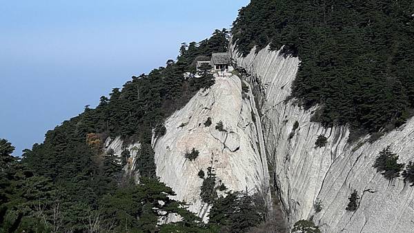 離開南峰頂的地標和華山論劍後輾轉來到位於南峰東側的南天門,這兒有兩棟建於清代的廟宇。穿過南天門不遠處便是聚仙台和長空棧道。長空棧道是華山派第一代宗師為遠離塵世靜修成仙,在萬仞絕壁上鑲嵌石釘搭木椽而建造的木道。這一段長空棧道分幾段長約百來公尺,一邊是險峻的懸崖,另一邊是峭壁,中間的木道狹小,一次只容一人經過,入行時必需手扶鐵鍊,面壁屏息挪步,走的人是手腳發軟,臉色發青,看的人是心驚膽顫。長空棧道是華山險道之首,要走棧道之前先看一下棧道入口處有「懸崖勒馬」四個字,告誡膽量不夠的遊客莫輕易去冒險,摔下山崖肯定是粉身碎骨的。