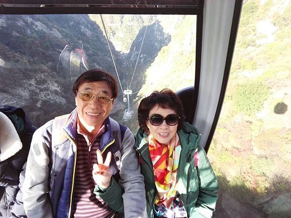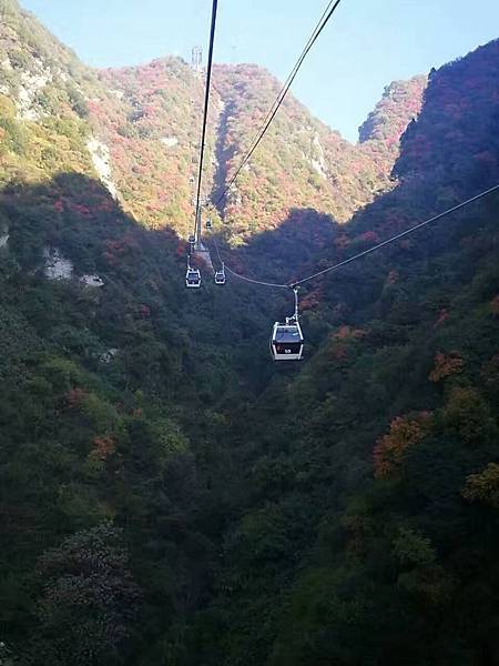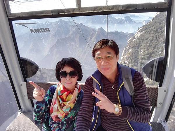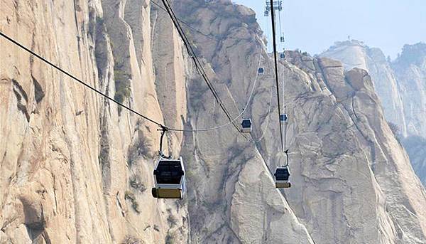 遊覽車是禁止進入景區的,從遊客中心購票後,改乘40分鐘電瓶車到索道口,搭上太華纜車,調整好雀躍的心情,準備感受華山之險,更期待一次能將華山的著名景點一網打盡。孫導說五峰中,西峰景色最美,所以我們選擇搭乘西峰索道直達西峰站,先遊西峰。西峰索道長4200多公尺,翻越重重高山峻嶺和溪谷,旅程需時20分鐘。