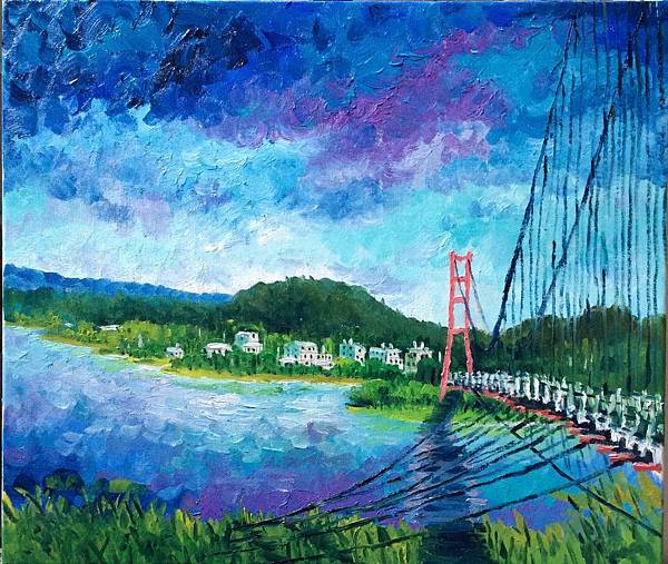 我畫的這幅油畫是日昇蓬萊吊橋及對岸的民居,天空和湖水我做了一些色彩的變化與加強,當天我們在現場是中午時分,晴空萬里無雲,畫面上比較沒變化,這是攝影和繪畫不一樣的地方。