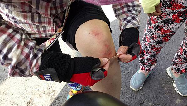 終於要離開公路,轉進鄉間小路了,也在此時不幸的事發生了,春嬌二姐摔車了,還好後面沒有大車跟上來,否則後果難以想像。春嬌很勇敢,上了藥以後繼續上路,沒有皺眉頭,沒有喊痛,更沒有延誤車隊的行程,只是在阿公店水庫騎一小段後,就退回大門口休息,因為情況不明,還是保守一點好,晚上回到高雄照了片子,確定是挫傷而已,這才放下心來。