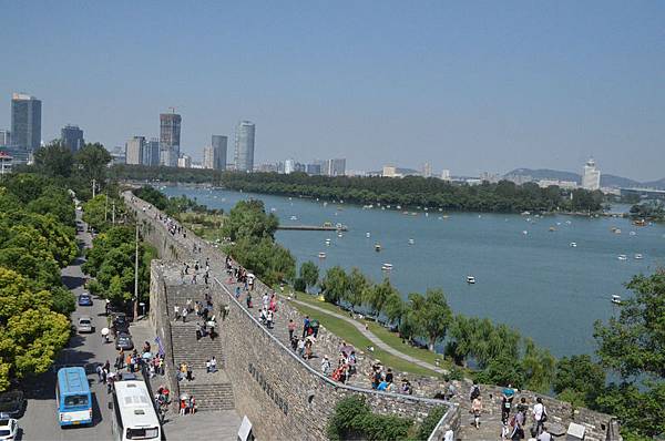 城牆氣勢磅礡,造型佈局嚴謹,構造獨特,堅韌不堅,固若金湯,充滿著懷舊滄桑感。漫步在寬敞的路面上,倚著城牆邊生長的樹高過了城牆,還開滿了各種不知名的野花,花香撲鼻,伸手即可採摘賞玩不盡。南京的明城牆風風雨雨屹立了650年歲月,繼承著南京城池的歷史,延續著老城牆的故事,這千年古城的紀傳,早已銘記在明城牆的古老城磚上了,看著這古老建築遺跡,一磚一瓦的歷史,讓人心有戚戚焉。由於是自由行,時間完全不受限制,我們在城牆上也盡情瀏覽了好久才慢慢走進玄武湖風景區。