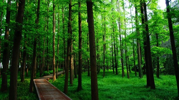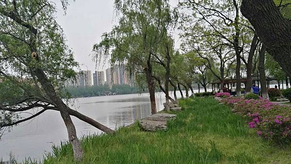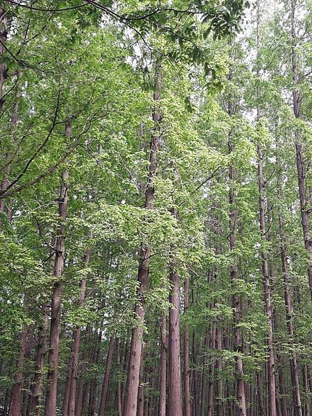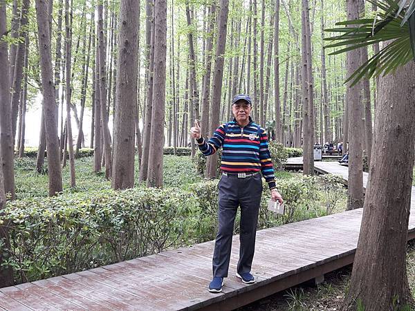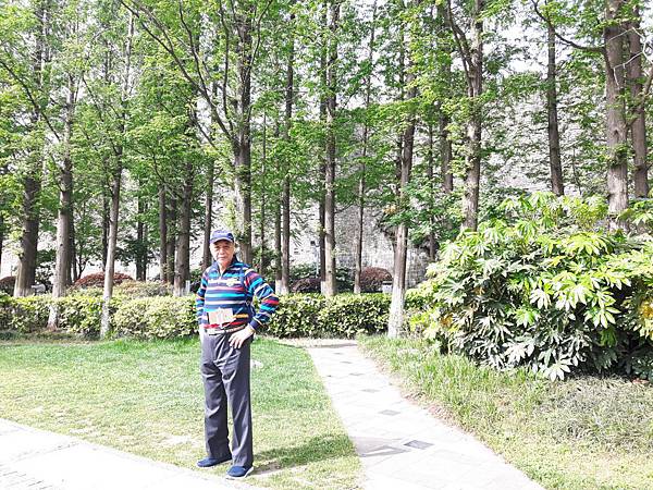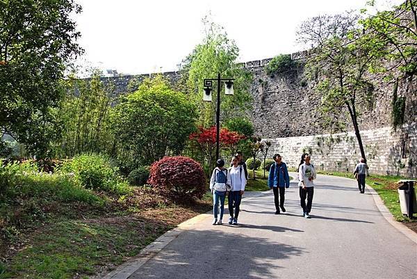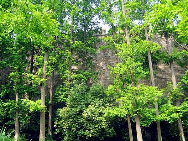 玄武湖畔還有綿延數百公尺的水杉林。春天的水杉剛抽出新芽,嫩綠的葉子一片欣欣向榮景像,這是我所看過中最美的水杉樹林了。樹林中架設了整齊的木棧步道,在林中漫步,耳際輕輕傳來薩克斯風的悅耳樂聲,原來有人在吹奏呢!高大挺拔蒼翠的水杉和旁邊古老的城牆形成一幅極美的風景。留連水杉林中,我忽然有種不捨得離開南京的感覺。
