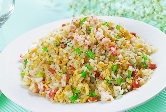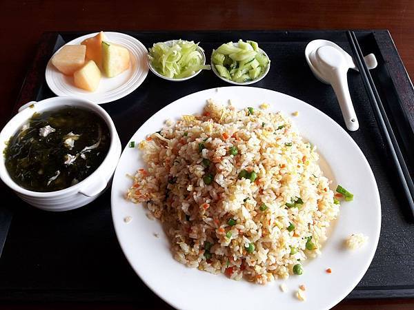 初到揚州的第一餐,先嚐嚐揚州的揚州炒飯,看看道地的揚州炒飯是怎麼地好吃。服務生說最典型的揚州炒飯是不加肉類的,重點在蛋的香氣。基本材料是白飯和雞蛋,輔以青豆、紅蘿蔔、蔥花,據說越簡單食材如能做出色香味俱全的揚州炒飯,那才是真正考驗廚師的功力。我覺得今天吃的揚州炒飯是滿意的,因為飯一端上來,那蛋香已經讓我招架不住,太香了!加上玻璃窗外綠草如茵的高爾夫球場景色,休閒的逸致濃郁,心情也越放鬆。