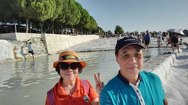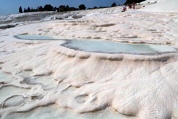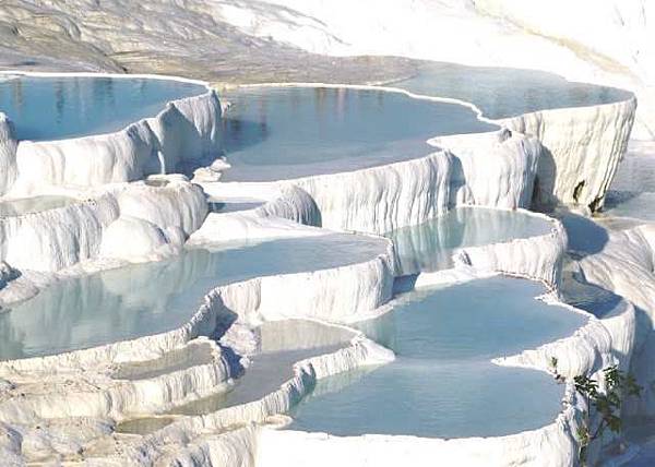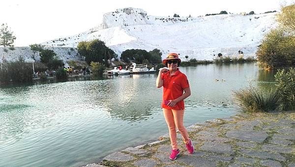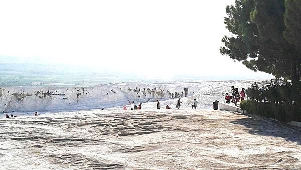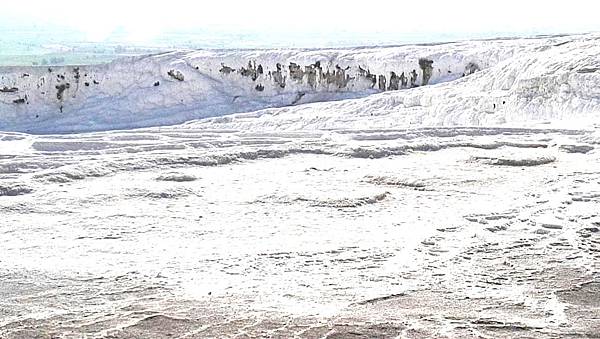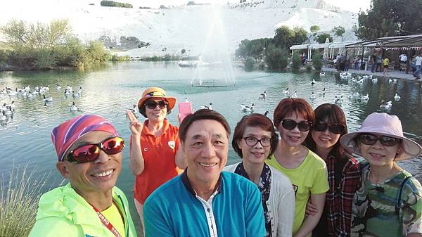 從棉堡山頂往下看,最下方的一池水好像白沙漠中的綠洲,水的粉藍中帶著透明,要不是石頭太濕滑,懸崖太陡峭,沒人敢陪我過去,否則真想下去一探究竟。回程時遊覽車停在棉堡山腳下,這裡有個大水池,一群大白鵝在池水中戲水,從下往上看棉堡很像一座積雪的山。