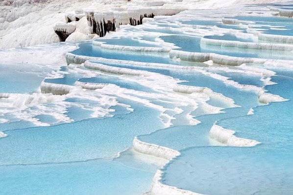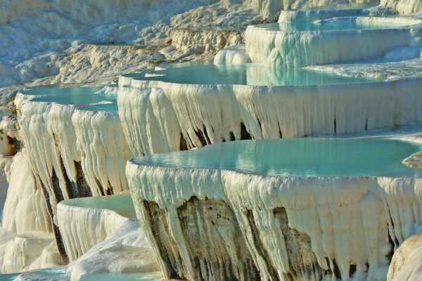 土耳其語Pamuk是棉花,kale是城堡的意思,所以帕穆嘉麗也稱為棉花城堡或棉堡。這裡是一個自然形成的石灰岩特殊地貌;平原200公尺上的希拉波里斯古城(Hierapolis) 因為地層下陷而形成如梯田式的溫泉池,從上方岩石中流出的溫泉水富含大量碳酸鈣和石灰質,泉水順著山勢迤邐而下流入各個溫泉池中,經過千年的石灰華結晶累積,造就了這層層棉花般雪白的天然奇景。每當陽光照拂這片棉堡時,泉水在一片白色中映出藍綠色調,蔚為奇觀。
