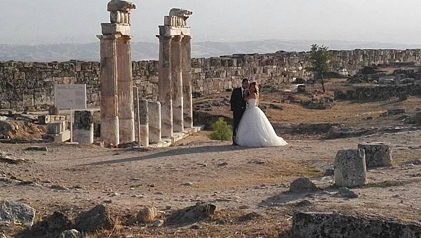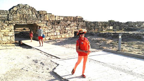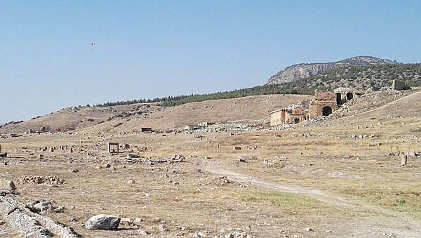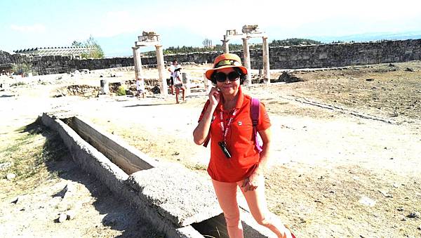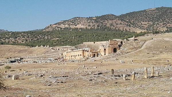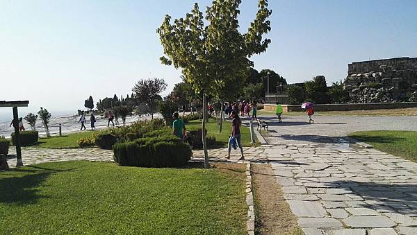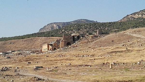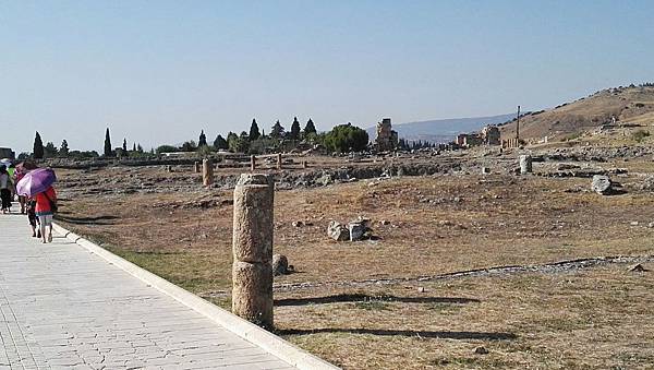 我們在烈陽下從遊客中心購票入景區,首先必需經過一大片希拉波里斯古城遺址,這裡是西元190年由佩加蒙王朝國王所建立。希拉波利斯意味著"神聖"的意思,由於古代人認為附近具有療效的溫泉是神聖的,尤其可治坐骨神經炎、婦科疾病等,固前往療養及長住的人絡繹不絕,逐漸此地變成一個聚落,有著古羅馬時期的神殿、劇場和教堂等等。一望無際的荒蕪,毀壞於地震的遺跡幾乎已難想像當初的風華。要去参觀棉堡必需經過古城遺址,再穿過小樹林後,左側就是壯觀的棉堡溫泉,在1988年已被納入世界自然及文化遺產。