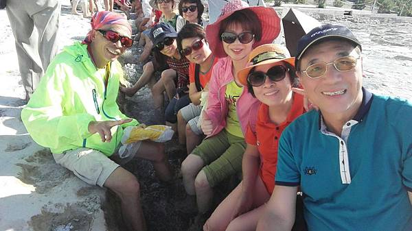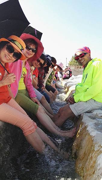 為了保護古蹟,遊客需要打赤腳進入該景點,由於熱又曬,大家對泡溫泉都興趣缺缺,加上景區內遊人多行走很不方便,只好坐在泉水兩側泡腳過過癮。溫泉水平均溫度只有35度,而且池水不深,要舒服享受泡湯樂趣還是回來台灣泡較理想。