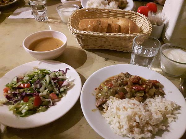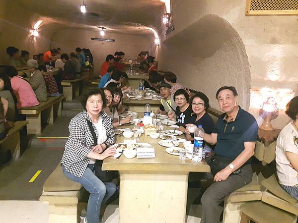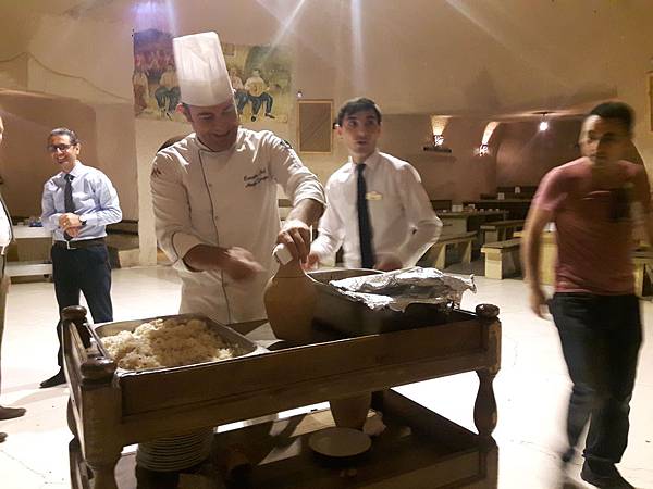 卡帕多其亞洞穴多,今天的午餐就是在洞穴餐廳Evrano享用美味的陶甕燉牛肉料理。旅行這麽多天以來,這一餐是最叫人懷念的,熱騰騰又香噴噴的燉肉超級美味可口,這是卡帕多其亞地區的特色菜。切成丁狀的牛肉加上蔬菜等各類食材放在陶盅裡燉煮,以麵團封住盅口,讓香味不流失,吃時把麵包拿掉再將肉倒出來,香啊!好吃極了。