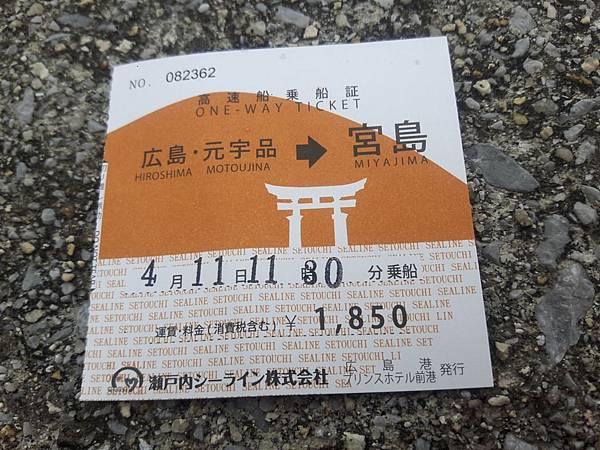 昨晚入住的廣島王子酒店除了有絕佳海景,飯店旁邊還有碼頭可以搭船至宮島,非常方便。在酒店櫃台買了船票,搭乘11:30分的船班前往神社之島~宮島。宮島是瀨戶內海廣島灣沿岸的一座小島,最有名的「嚴島海上神社」與海上鳥居是宮島標誌景點,也是聯合國教科文組織選定的世界文化遺產。
