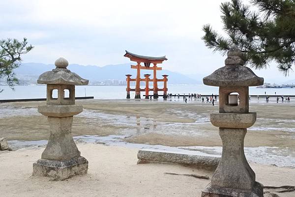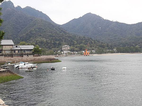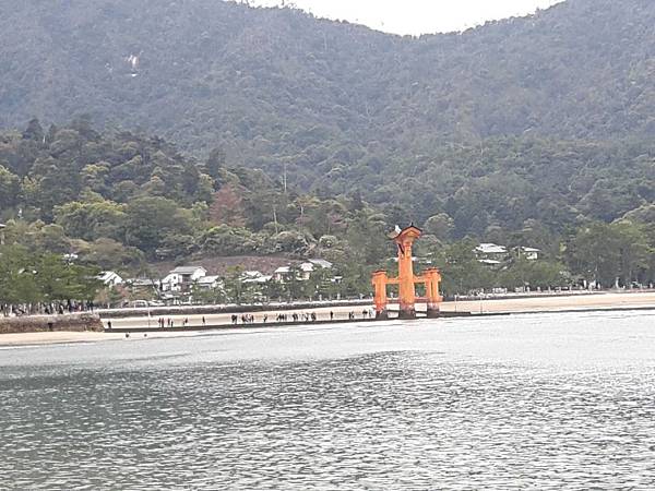 汽船航行約15分鐘後,遠遠地就能看到紅色大鳥居出現在視線中,碧藍的海水加上鮮綠背景的彌山,紅色的鳥居矗立海中,非常顯眼。鳥居前方嚴島神社朱紅色的典雅神殿也隱隱約約出現在遠處,由於是退潮時間,大鳥居和神社是呈現在陸地上的景象,若是漲潮時,鳥居、神社加上水面上的倒影又是另一道美麗的風景。