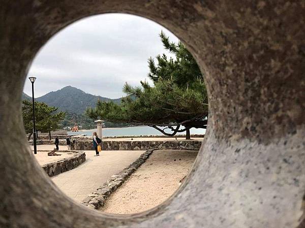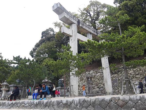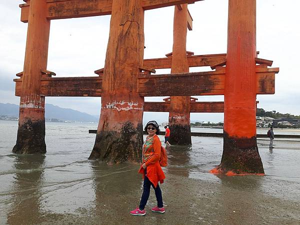船終於靠岸了,我們先到棧橋寄放行李後再慢慢沿著靠海邊的小路和沙灘步行,離大鳥居越來越近了,更能感覺到它的氣勢逼人。在日本,凡是有神社的地方就一定有鳥居,它是用於區分人與神居住俗界的一個標誌。鳥居有大有小,而嚴島神社的這座海上大鳥居是數一數二的,自1168年便已屹立在海岸邊。現在看到的這一座大鳥居是第八代,建於1875年,自今已143年。左右兩根粗大的柱子是由500年樹齡以上的樟木或楠木製成,高16m,寬24m,重約百噸。鳥居並非埋在沙中,而是靠著本身的重量穩如泰山般永久矗立在瀨戶內海的浪濤中。