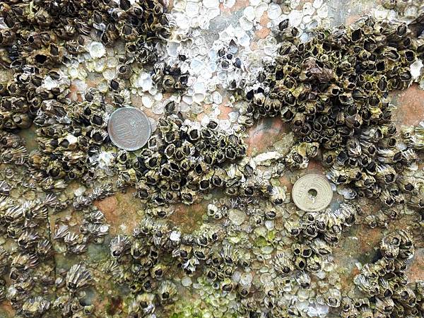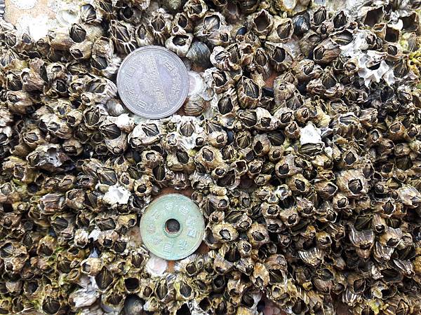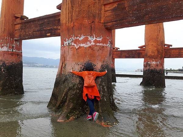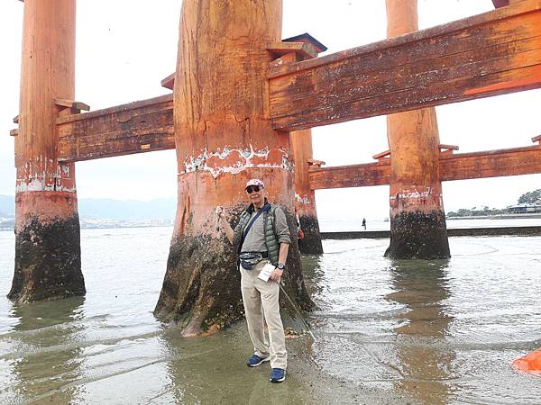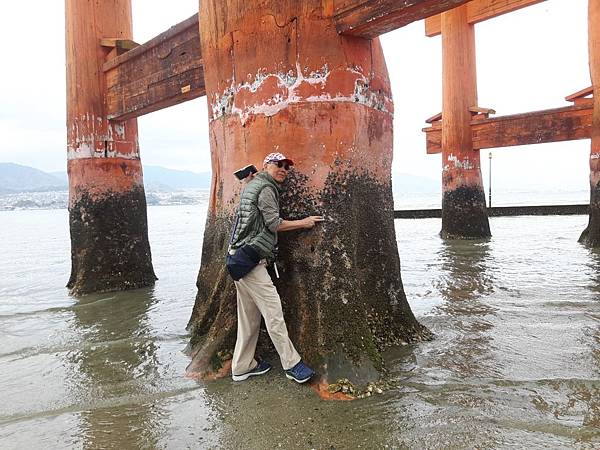 近距離觀察這座雄偉的大鳥居,由下往上仰望,氣勢磅礡。由於常年潮起潮落,它的底座已經附著了密密麻麻的貝類和藤壺,地上還散落著許多零錢。傳說遊客把許願銅板嵌在貝類中,若海水退潮後,銅板沒掉落地上,願望將會實現,但我們都沒嚐試,畢竟能經得起考驗的銅板太少了。