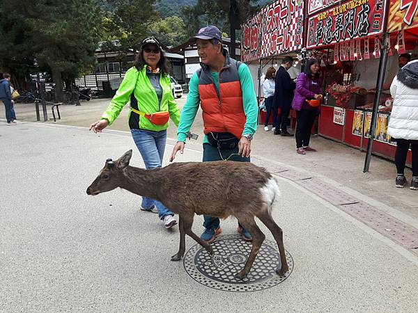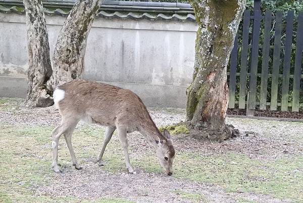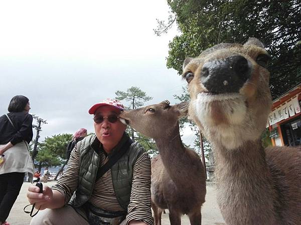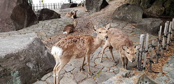 從大鳥居的左側往上走,我們打算繞著嚴島神社走一圈,因為在這裡有幾棵粉色櫻花仍然盛開著,而且遊客也較少。宮島跟奈良一樣有許多野生的鹿,走在参拜街道上,常看到不少的鹿在滿街閒晃,它們不怕生也很溫馴,在這裡,鹿被視為神的使者般善待著,真是好鹿命啊。