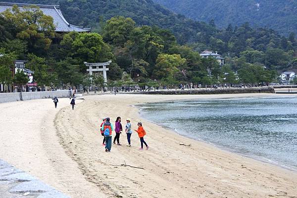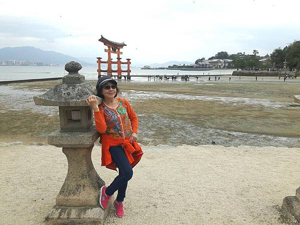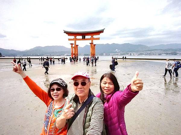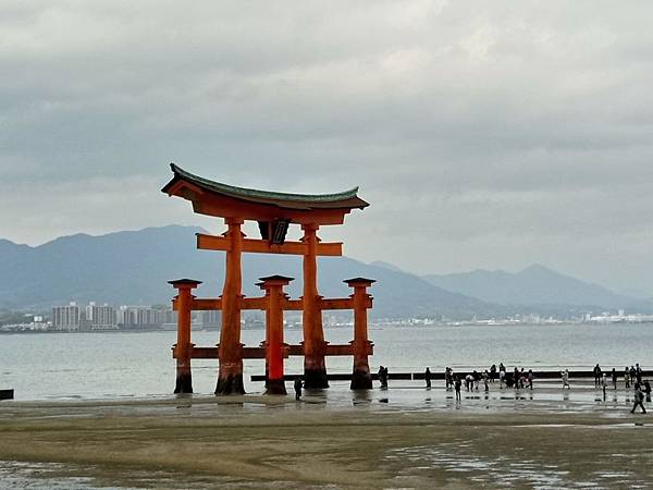 輕鬆遊逛了三個小時,還有多處景點無法盡興也只能期待下一回了。再走回到海岸邊時已開始漲潮,大鳥居底部已漸漸沒入海水中。水中的鳥居讓人有難以親近遙不可及的感覺,也增添了它的神祕感。本想看嚴島神社也浮在水中的夢幻情景,但要等很久,時間上不允許,因為我們接著還有行程;必需搭JR回到尾道市。