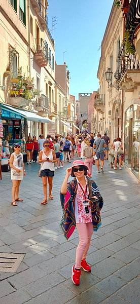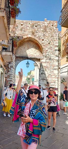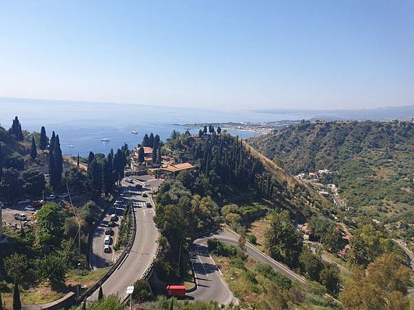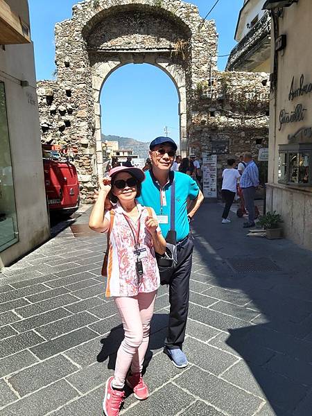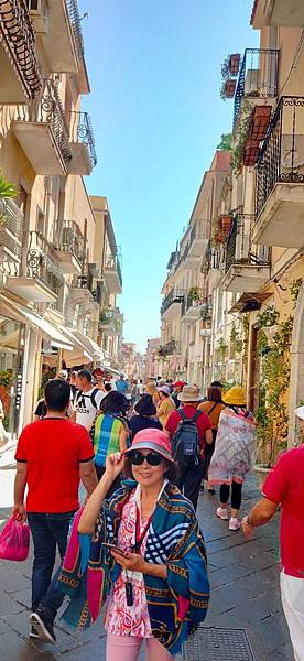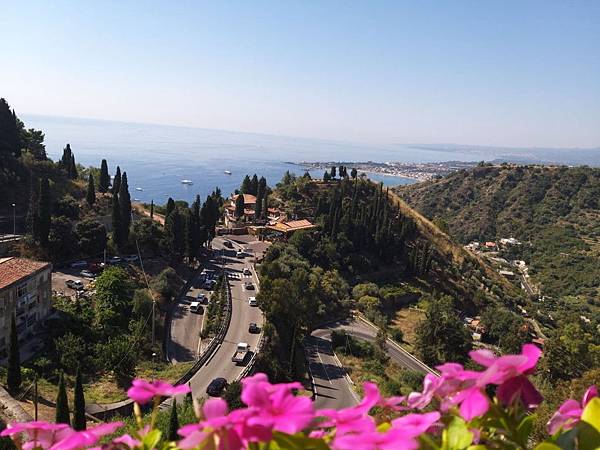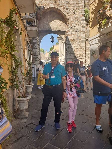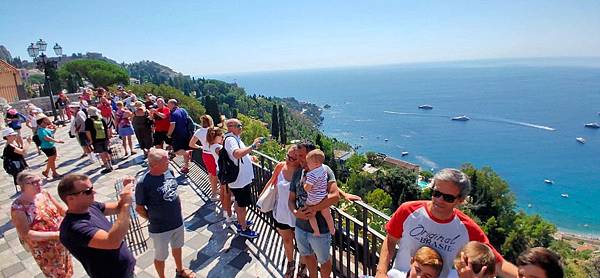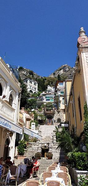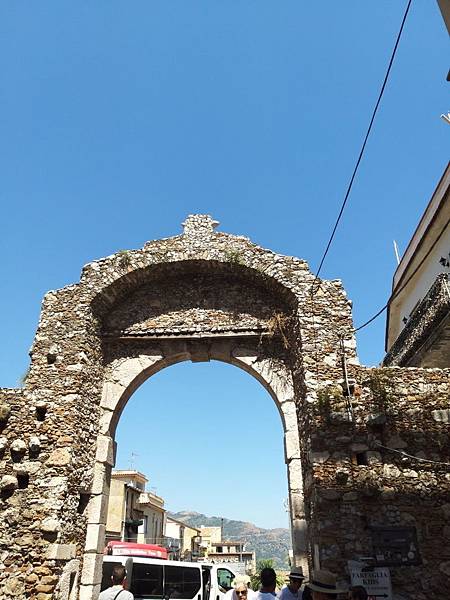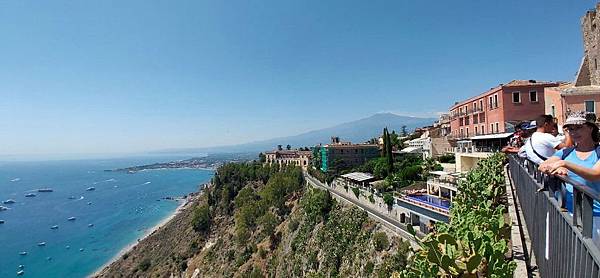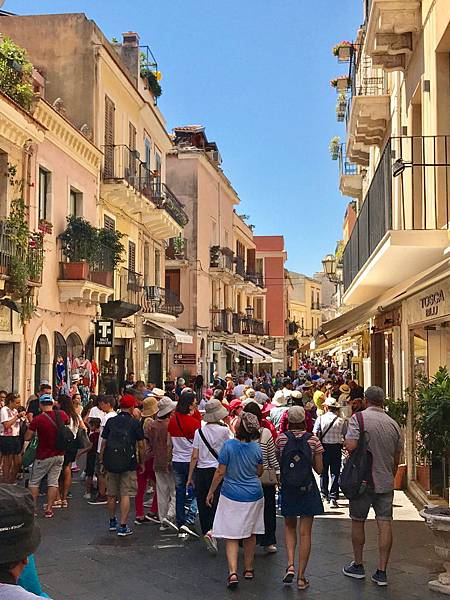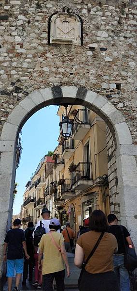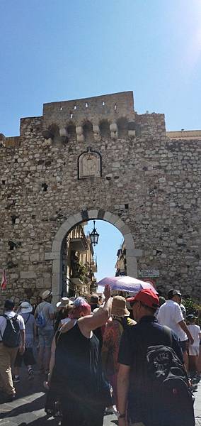 陶米納位在海拔206公尺的高地上,位處陶羅山半山腰,面向愛奧尼亞海岸,背向歐洲最高埃特納活火山(Mt.Etna) ,風景秀麗,是義大利著名的蜜月和渡假勝地。遊覽車只能停在山腳下,領隊帶我們搭電梯到高台上的陶米納。不愧是渡假勝地,遊客非常多,大夥兒跟著人潮步上石階,從這兒就可以看到遠處美麗的海景,穿過古老的Porta Cantania 城門,走在滿是遊客的主要幹道翁貝托一世(Corso Umberto I)大道上,小城風光一一展現眼前。