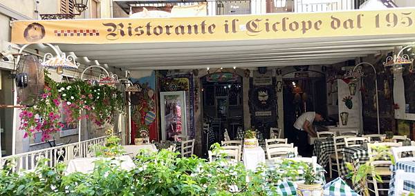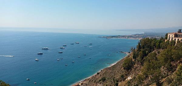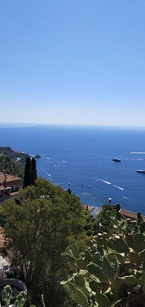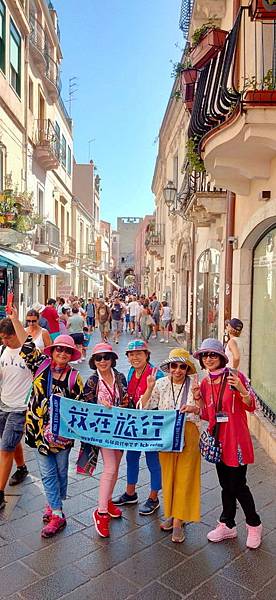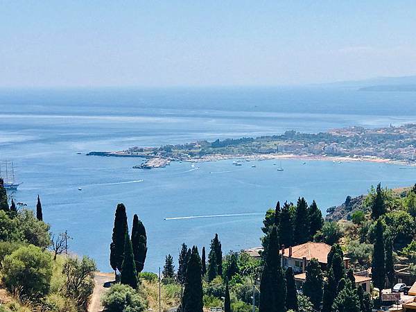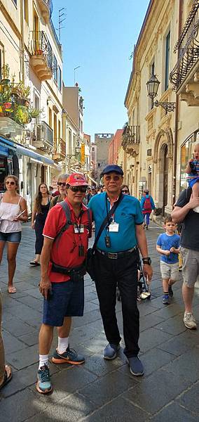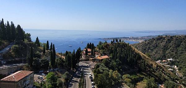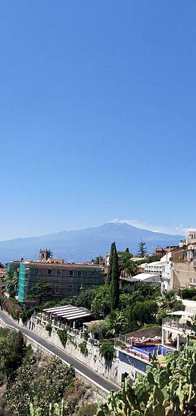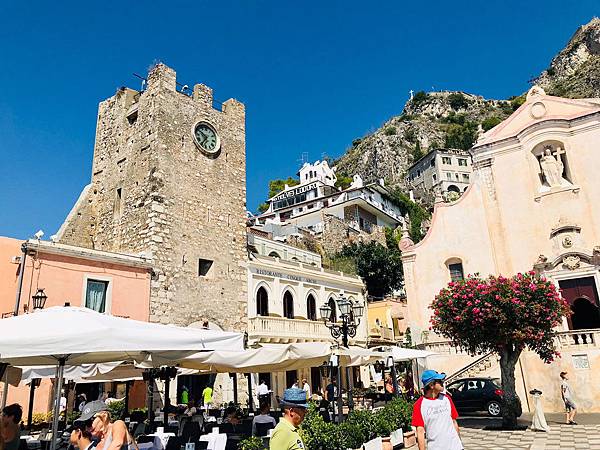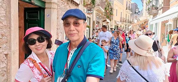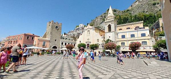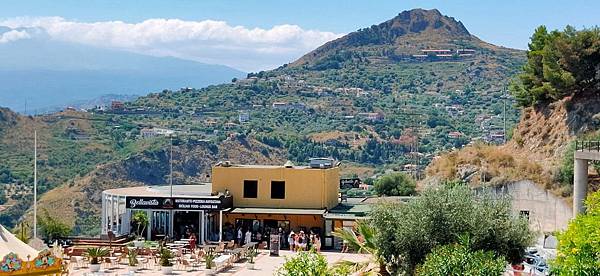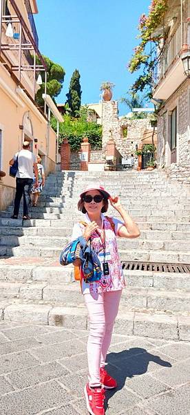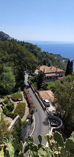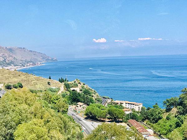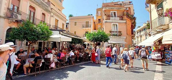 陶米納位在海拔206公尺的高地上,位處陶羅山半山腰,面向愛奧尼亞海岸,背向歐洲最高埃特納活火山(Mt.Etna) ,風景秀麗,是義大利著名的蜜月和渡假勝地。遊覽車只能停在山腳下,領隊帶我們搭電梯到高台上的陶米納。不愧是渡假勝地,遊客非常多,大夥兒跟著人潮步上石階,從這兒就可以看到遠處美麗的海景,穿過古老的Porta Cantania 城門,走在滿是遊客的主要幹道翁貝托一世(Corso Umberto I)大道上,小城風光一一展現眼前。