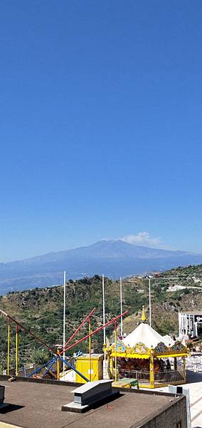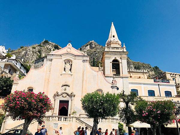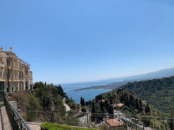 走著走著就來到了4月9日廣場 ( Piazza IX Aprile ),這個廣場是個開放式的展望台,從這裡可以眺望美麗的愛奥尼亞海岸線,這裡也是最多遊客聚集的地方。坐在廣場的長椅上欣賞眼前的海灣,藍天白雲,景色非常漂亮,從廣場遠眺還可以將海拔3323公尺的埃特納火山盡收眼底。廣場上還有名勝教堂和粉色的科爾瓦亞宮。