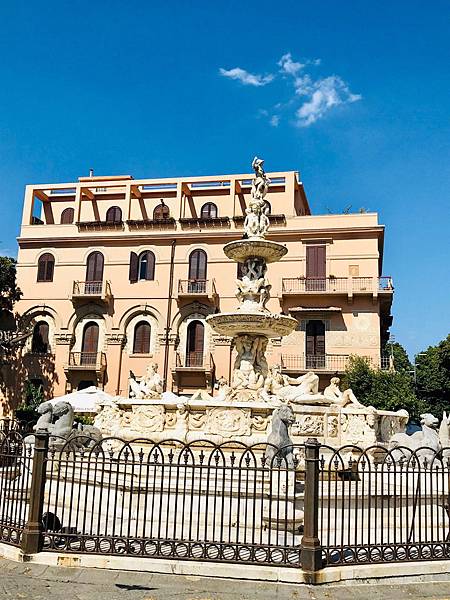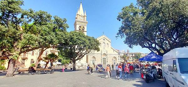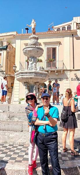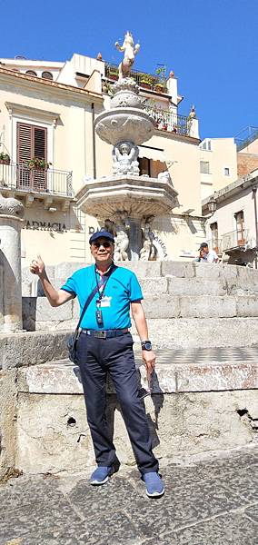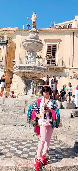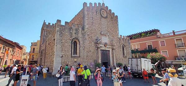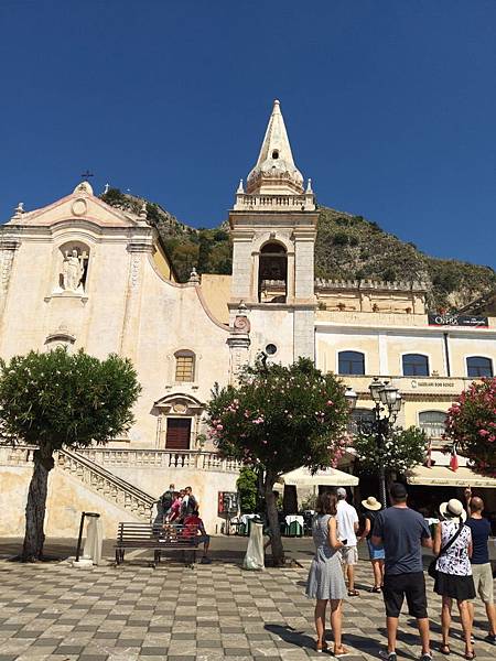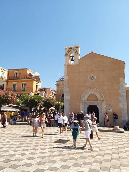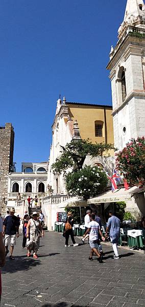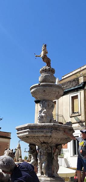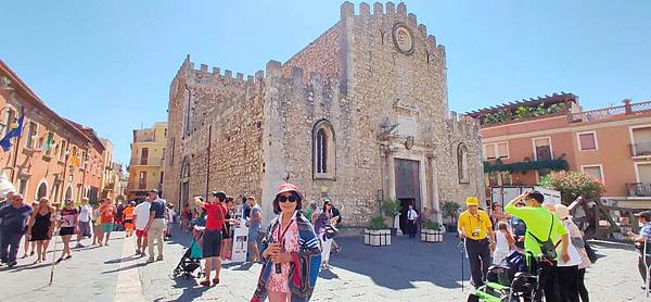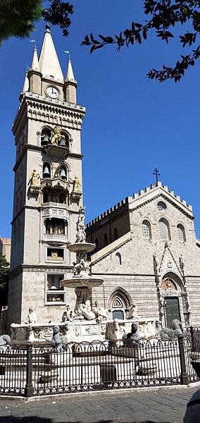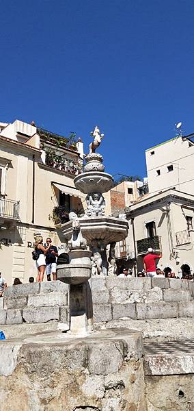 沿着翁貝托一世大道繼續前行便可以看到另一個比較小型的廣場~大教堂廣場 ( Piazza del Duomo ) 廣場上有個女半人馬雕像的噴水池,這個雕像是陶米納的象徵,旁邊是古教堂
