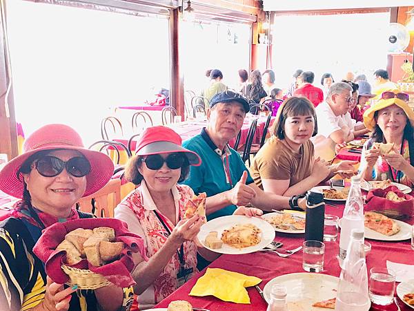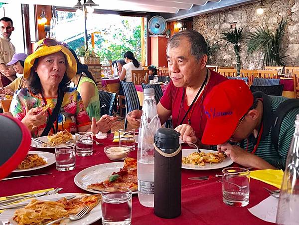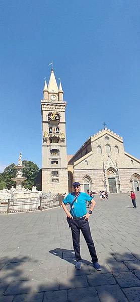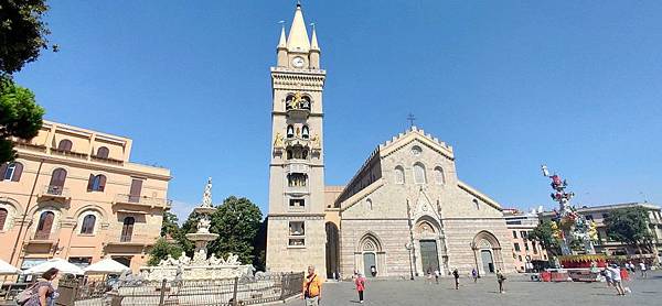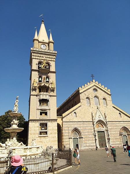 再往前行是梅西娜城門(Messina) ,也是翁貝托一世大道的終點,所以其實這條主要的街道是被兩座城門包圍起來的,Messina和Cantania城門一南一北把陶米納夾在中間。由於時間的關係,我們只走到梅西娜城門便到了午餐的地方。午餐的餐廳位在艾曼紐廣場旁,今天吃Pasta 和Pizza,午餐後原路回到遊覽車上,一小時後回到梅西娜參觀奧利安大教堂。矗立在教堂廣場上的大教堂整體建築氣勢宏偉,一旁的奥利安噴泉正維修中,轉了一圈回到車上,時間也差不多了,下午3:15分返回遊輪上準備参加今晚的船長之夜晚宴。
