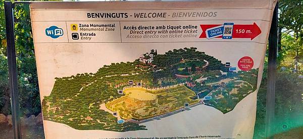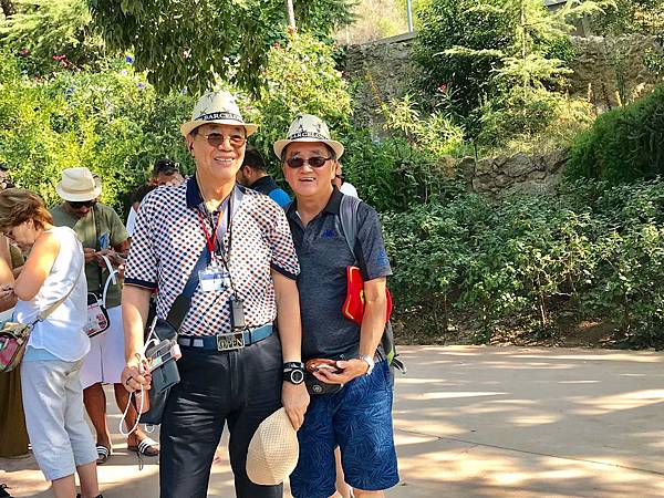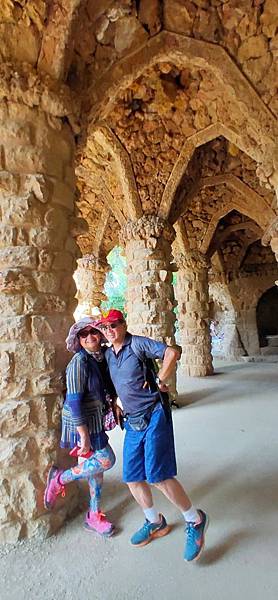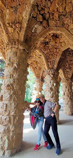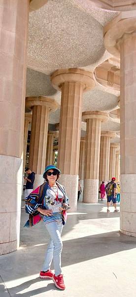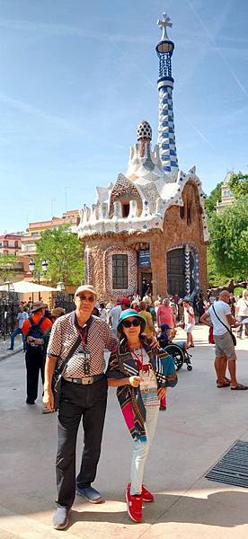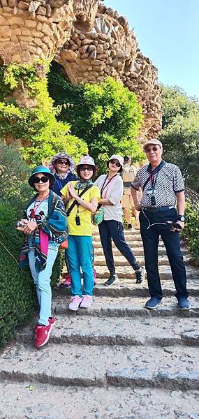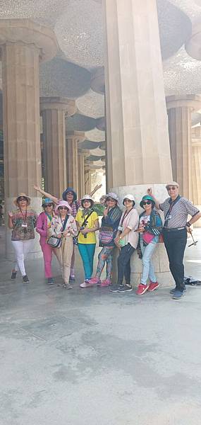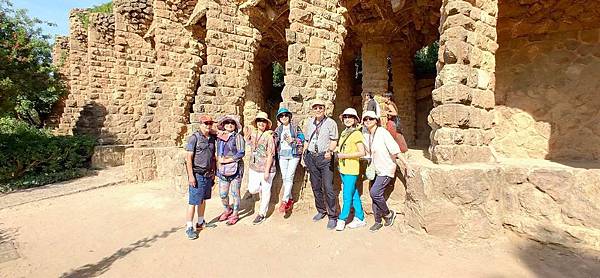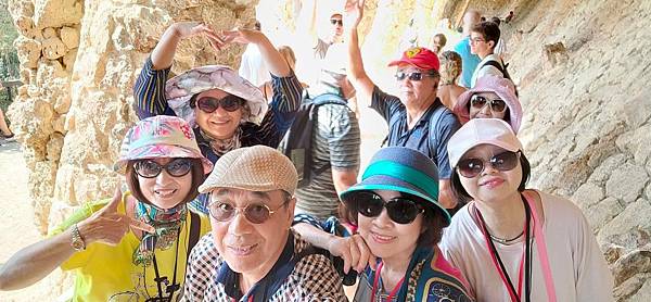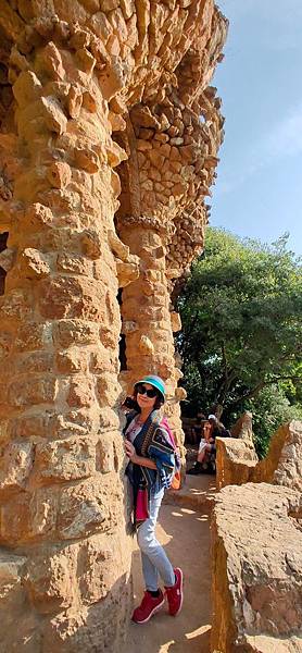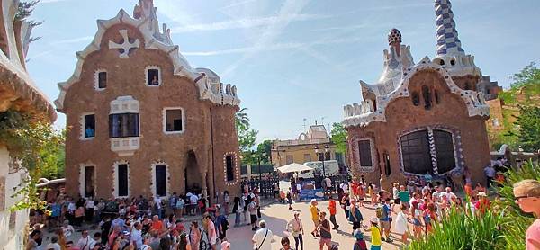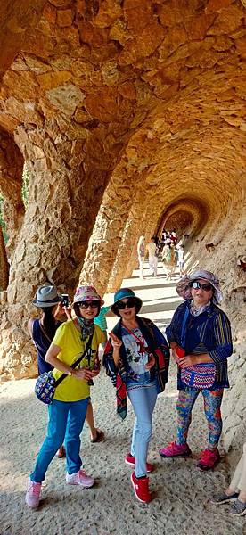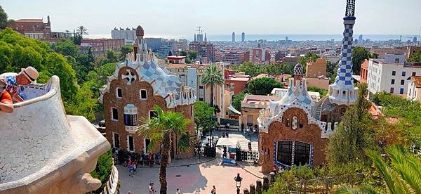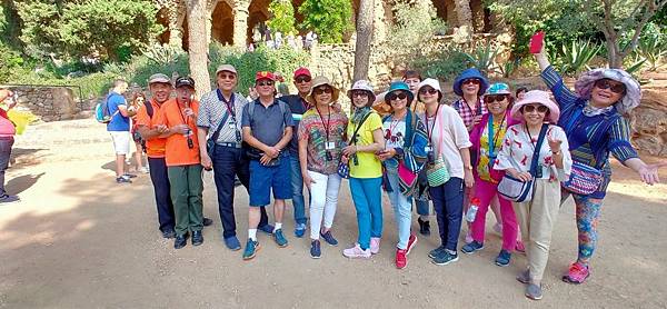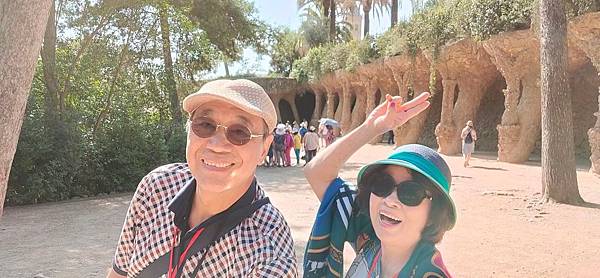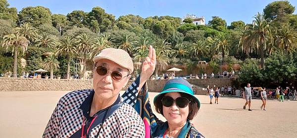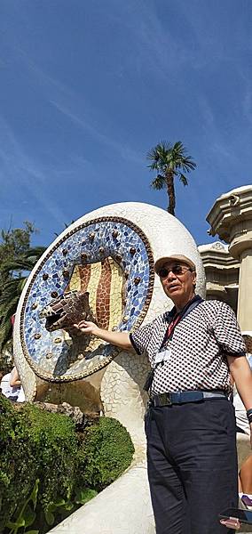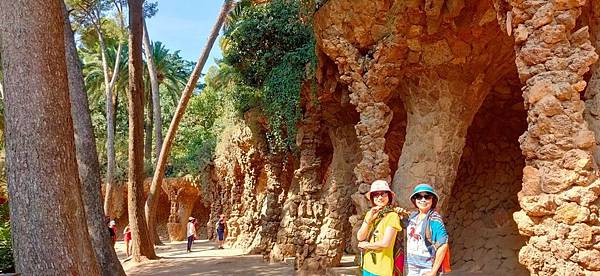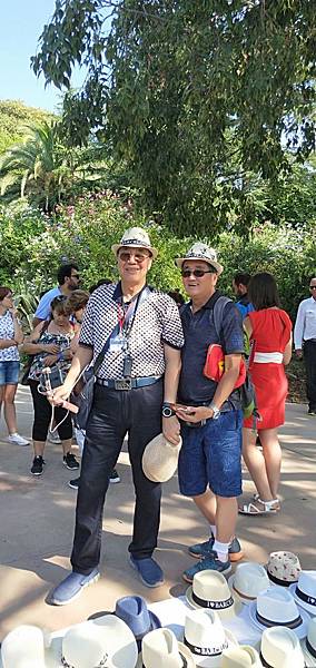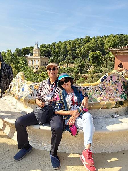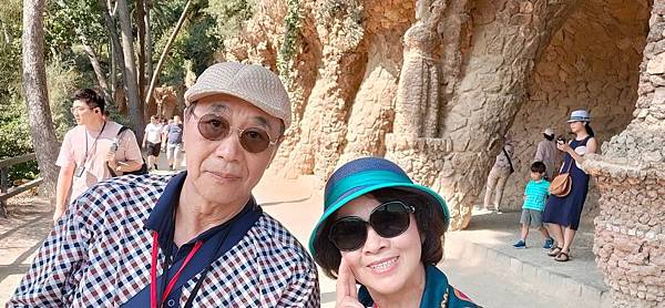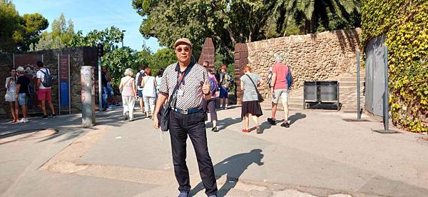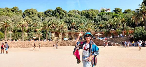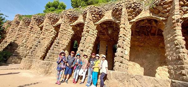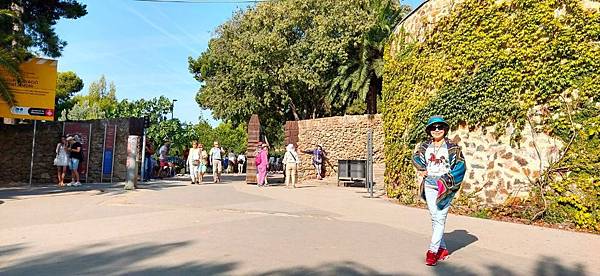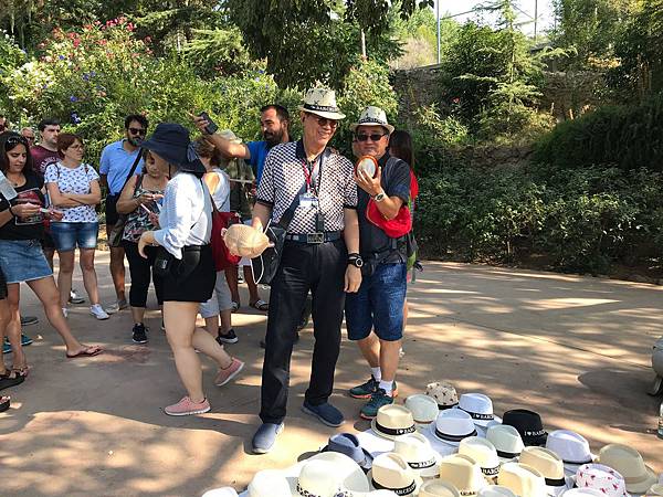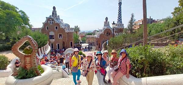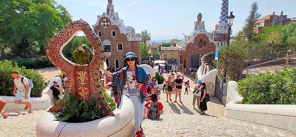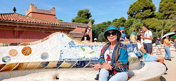 9:50分轉往奎爾公園(Park Guell)參觀。從遊覽車下來,順著馬路步行至奎爾公園入口,兩旁都是販賣紀念品的攤販,從帽子到首飾,琳琅滿目,但時間有限無法慢慢瀏覽或購買,這就是跟團最大的缺點。
