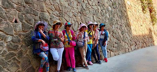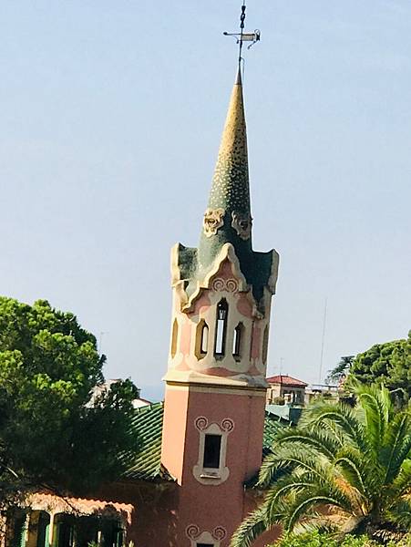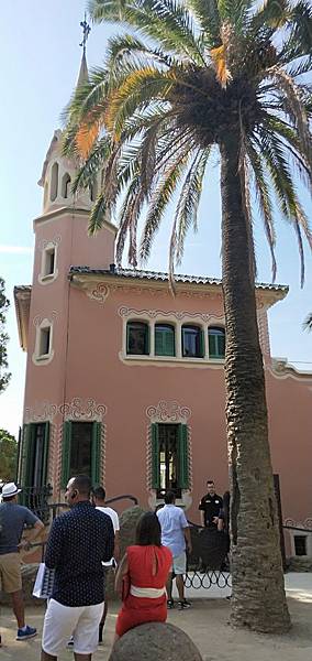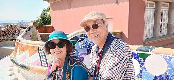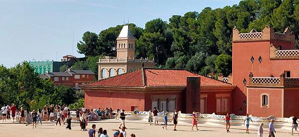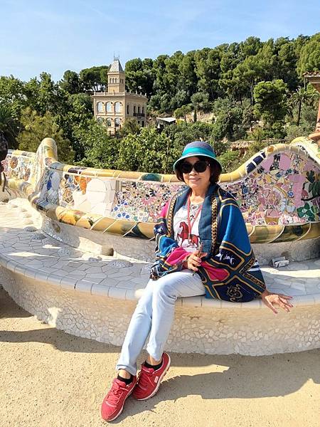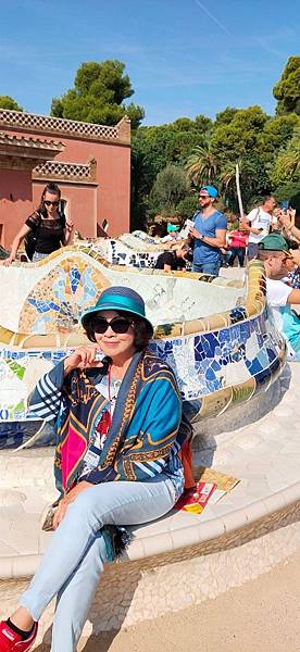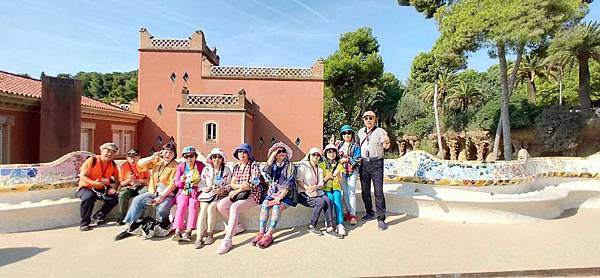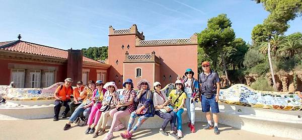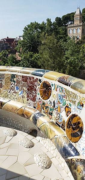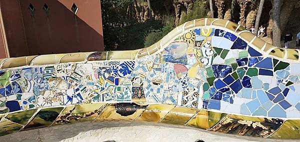 順著小路往前行,經過高第粉紅色的故居 粉紅塔(Torre Rosa) ,現已改為博物館。 再往前行可抵達公園小廣場~自然廣場,廣場右側便是高迪用彩色馬賽克磁磚拼貼出來的波浪蜿蜒形馬賽克座椅。五顏六色的馬賽克拼貼細膩精緻,多種形狀與色彩交錯的淋漓盡致,在藍天的襯托之下,每個角落都充滿童趣與驚喜,座椅也很舒服,大夥兒拍照,樂不可支。