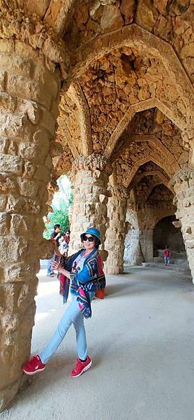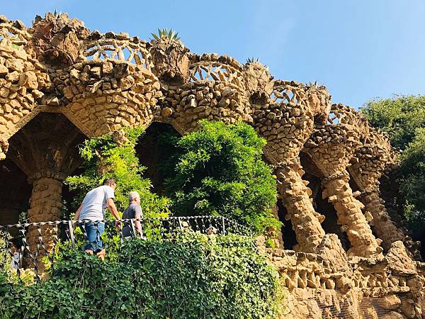 往下走會先看到一片由不規則石塊堆砌的山壁與石柱迴廊,螺旋般的石柱向前延伸,傾斜將近45度的廊柱一根一根地矗立倚靠著山壁,形成一處特殊的造景,這裡就是奎爾公園的洗衣婦長廊(The Laundry Room Portico) 。