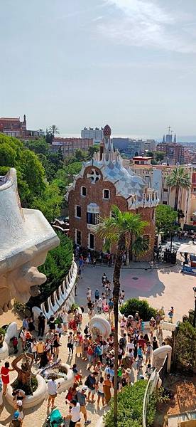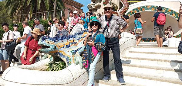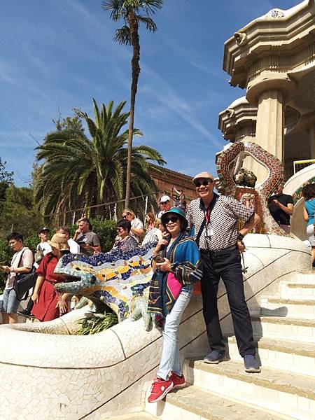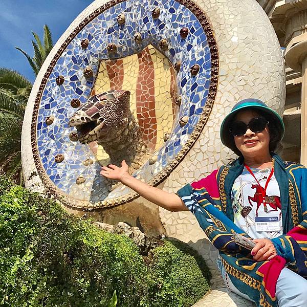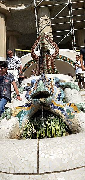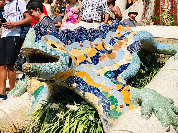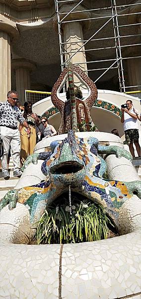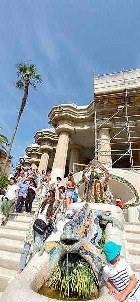 從平台拾級而下,入潮最多的地方就是整座公園最具代表性的景點~七彩馬賽克大蜥蝪,它是奎爾公園的吉祥物,沒跟它合照表示你根本沒來過奎爾公園,所以遊客都會搶拍,人一多畫面就難講究了。可愛的馬賽克彩龍噴泉和五彩繽紛的大蜥蜴有著滿滿的童趣,讓奎爾公園顯得趣味盎然,孩童們看了尤其開心。