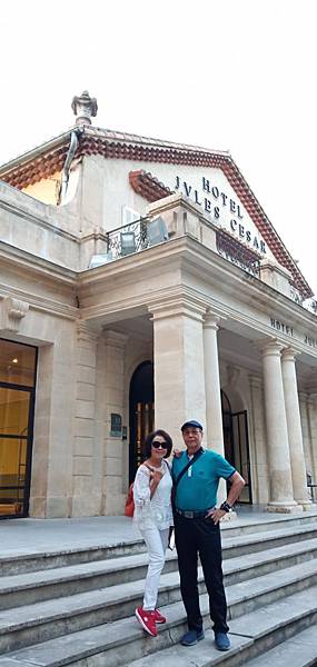 昨夜住宿的凱撒大飯店位在老城中心區,是由一幢17世纪的貴族城堡改造而成,是亞爾勒市區唯一的五星級酒店。酒店外觀古老典雅,大廳的沙發和桌椅有獨特造型和圖案,樓梯間甚至地板馬賽克都充滿貴族風。