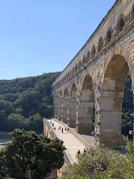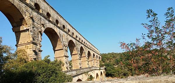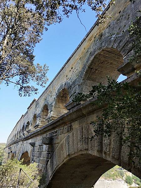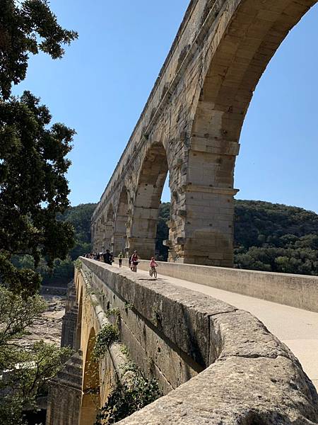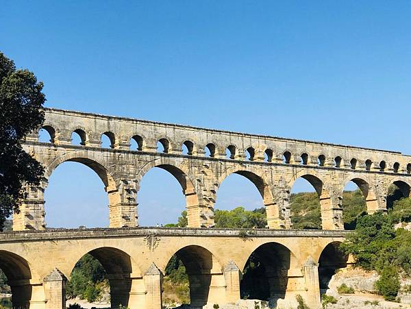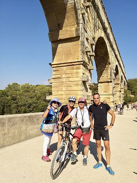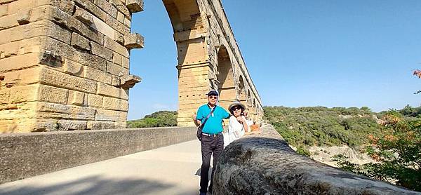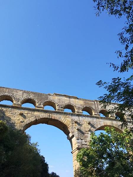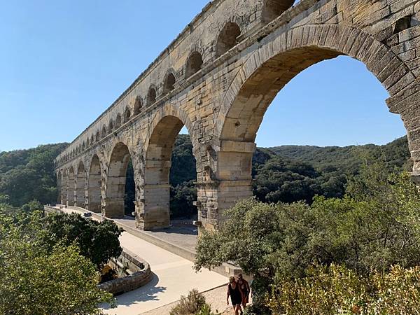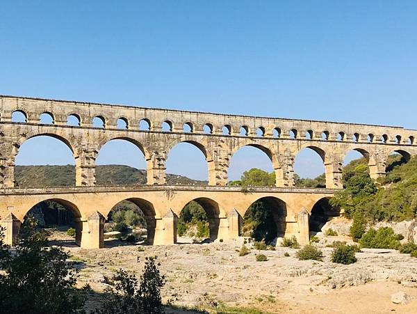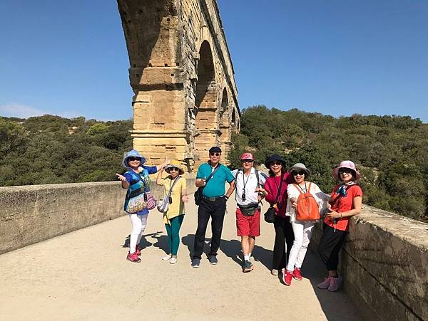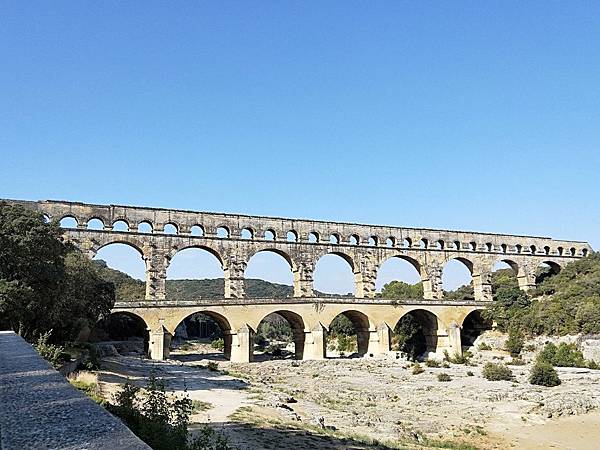早上用餐後,9點離開亞爾勒,10點到達尼姆與亞維儂之間的城鎮~嘉德(Gard),參觀曠世文化遺產〝嘉德水道橋〞(Pont du Gard)。修建於公元前一世紀的水道橋雄霸一方,從停車場遠遠地就可以看到它的身影,行經一小片梧桐樹林,走上緩坡就到了水道橋上。巨大的石橋全長約280米,高達50米,有著52座大大小小的拱門造型,全以石塊搭建而成,共花了5年時間,是目前世上僅存的古羅馬帝國3層水道橋,當時擔負著將北方烏澤(Uzes)水源從50公里外渡過加東河運送到缺水的尼姆。