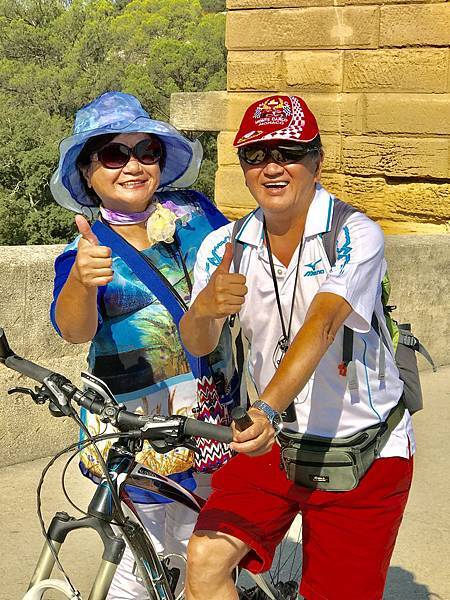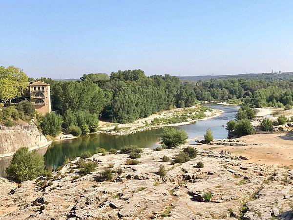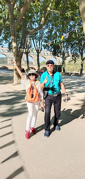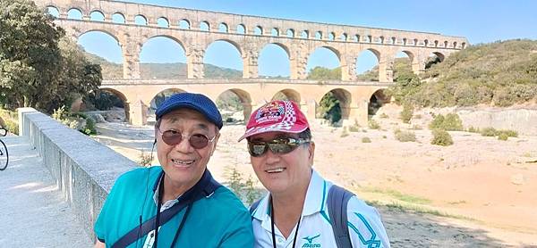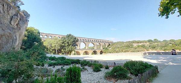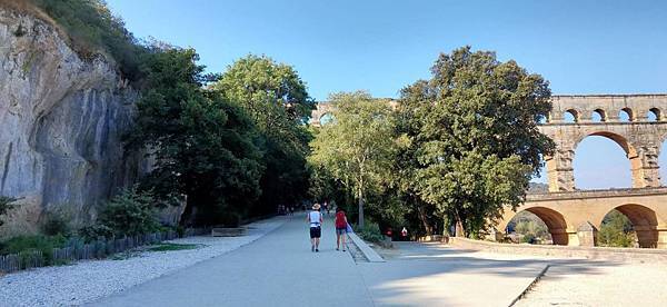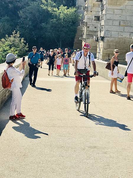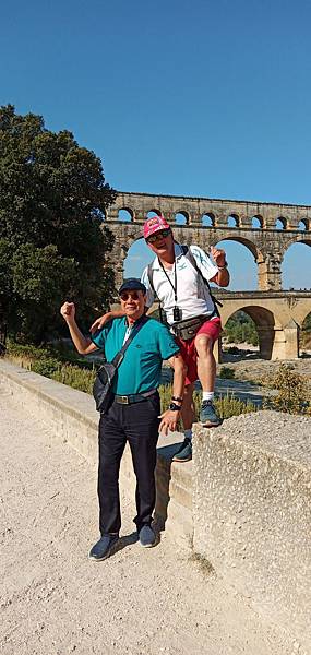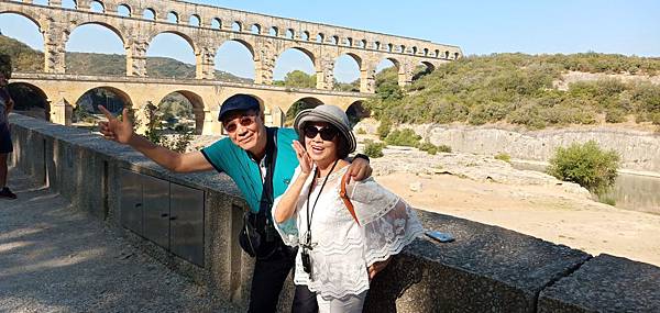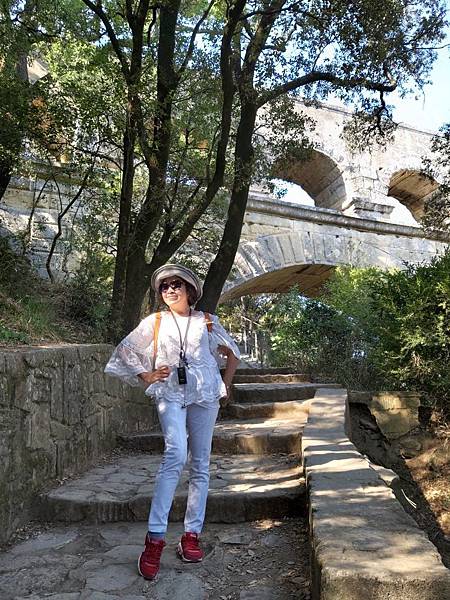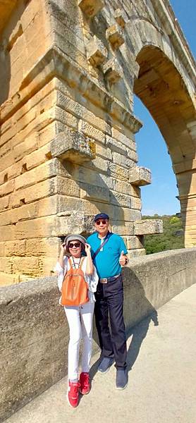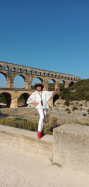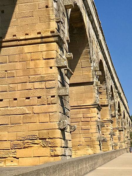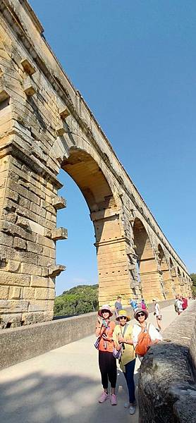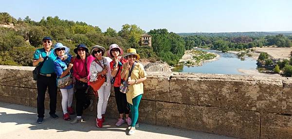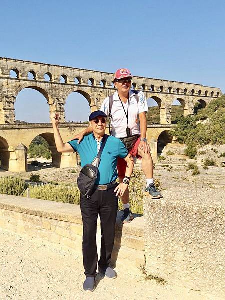 早上用餐後,9點離開亞爾勒,10點到達尼姆與亞維儂之間的城鎮~嘉德(Gard),參觀曠世文化遺產〝嘉德水道橋〞(Pont du Gard)。修建於公元前一世紀的水道橋雄霸一方,從停車場遠遠地就可以看到它的身影,行經一小片梧桐樹林,走上緩坡就到了水道橋上。巨大的石橋全長約280米,高達50米,有著52座大大小小的拱門造型,全以石塊搭建而成,共花了5年時間,是目前世上僅存的古羅馬帝國3層水道橋,當時擔負著將北方烏澤(Uzes)水源從50公里外渡過加東河運送到缺水的尼姆。