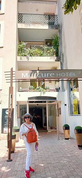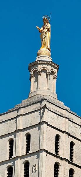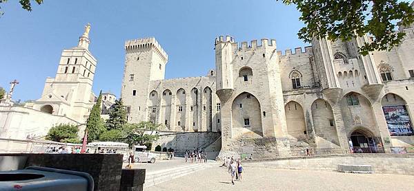 午餐後先check-in 廣場附近的Mercure Hotel,下午2:30分安排遊覽世界文化遺產~教皇宮。大夥兒在廣場邊等候來會合的當地導覽員希媚爾。廣場的左方鐘塔頂端有一尊金碧輝煌的聖母像,這座建築很吸睛,是建於12世紀的聖母大教堂,教堂另一邊是岩石公園和小皇宮美術館。