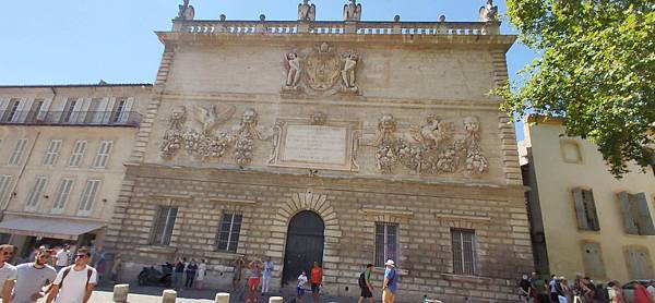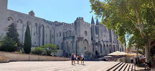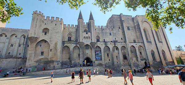 跟著領隊的腳步穿街走巷,來到市中心的鐘樓廣場,眼前的雄偉建築有市政廳、14世紀的哥德式鐘塔、12世紀的修道院和聖母院,再往前是教皇宮廣場以及高50米如大碉堡般的大建築~教皇宮(Palais des Papes) ,這一整個亞維儂景區已被Unesco列入世界文化遺產名錄。