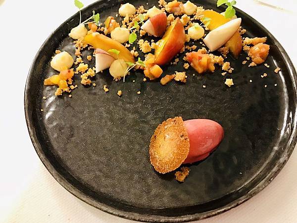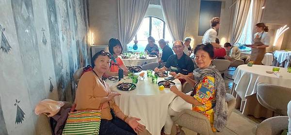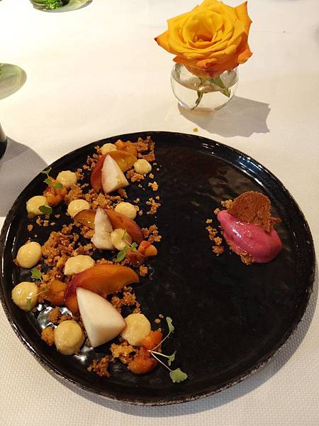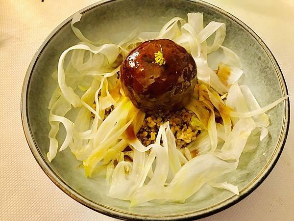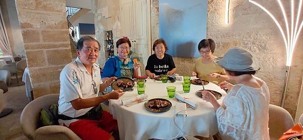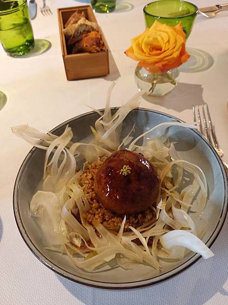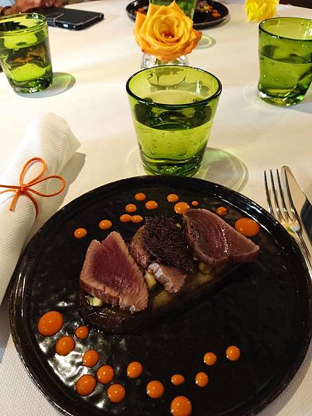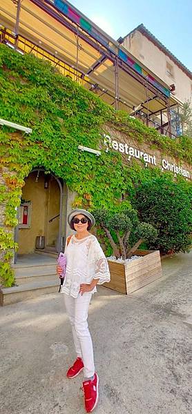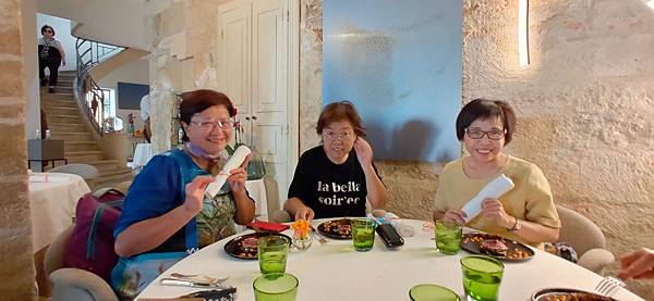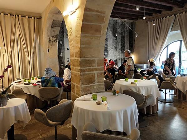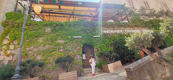 午餐的餐廳 Restaurant Christian Etience 位於教皇宮的右側,外牆上爬滿了綠油油的藤蔓,相當別緻,餐廳內部優雅溫馨,是一家米其林推薦餐廳。今天的午餐是羊肉丸子,吃羊肉的則提供香煎鱸魚,很期待的午餐,每個人都吃得開心。