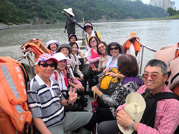 回程走藍線水岸步道、步道依山傍水、俯臨碧潭、山光水色、風光旑妮、美不勝收。下山的山徑路况良好、一路往下走、穿過一片麻竹林後抵達一處小村聚落、繼續向前行、循著指標來到渡船頭、每人付20元船資渡河。新店溪的擺渡、純靠人力操作、只見船伕站在船尾、搖著櫓槳、動作熟練、船隻緩緩浮江而行、不過五分鍾光景、渡船就橫越過約一百公尺的新店溪、抵達新店的渡口。