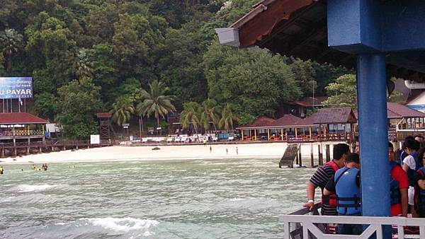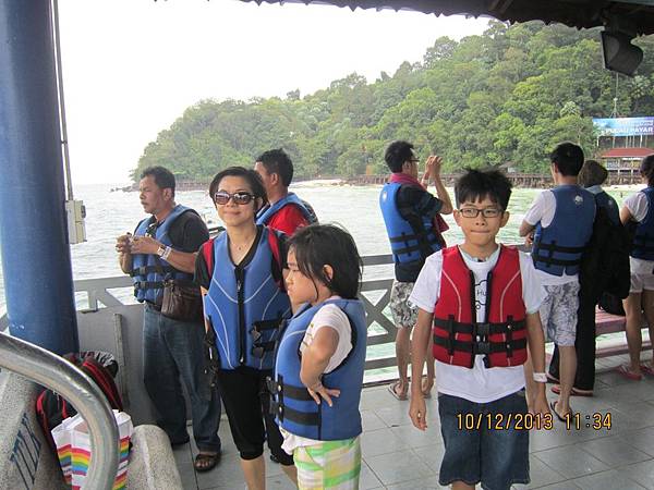 早上八點在酒店大門口集合、遊覽車到每一家酒店陸陸續續接有預約的客人前住乘船碼頭。参加浮潛的遊客很多、亂哄哄的、不同的承辦單位在他們的遊客手腕上分別戴上不同顏色的手環以方便辨識、接下來就上船出發前往芭椰島了、航程大約1.5小時。今天是個陰雨的天氣、海象很差、風浪大還下著小雨、這種天氣出海實在有點掃興、尤其是當渡輪到目的地後、我們還得換乘小艇才可以到達芭椰島的浮台上登島、大浪把小艇打得搖晃不停、雖然我們都穿了救生衣、但換船過程驚險、真叫人捏了一把冷汗、幸好到浮台的距離只有60公尺遠、真擔心小艇會被海浪打翻、現在回想起來還心有餘悸呢!